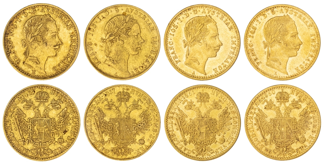 (g) Austrian Empire, Francis Joseph (1848-1916), Ducat, 1857 A, Vienna, young laureate bust right, rev. crowned imperial eagle, edge milled, 3.46g, 12h (KM 2263; Fb. 233), very fine; another, Ducat, 1860 A, Vienna, edge milled, 3.46g, 12h (KM 2263; Fb. 233), lustrous, good very fine; another, Duat, 1861 A, Vienna, edge milled, 3.44g, 12h (KM 2264), with lustre, good very fine; another, Ducat, 1865 E, Alba Lulia, edge milled, 3.47g, 12h (KM 2264; Fb. 235), very fine (4)