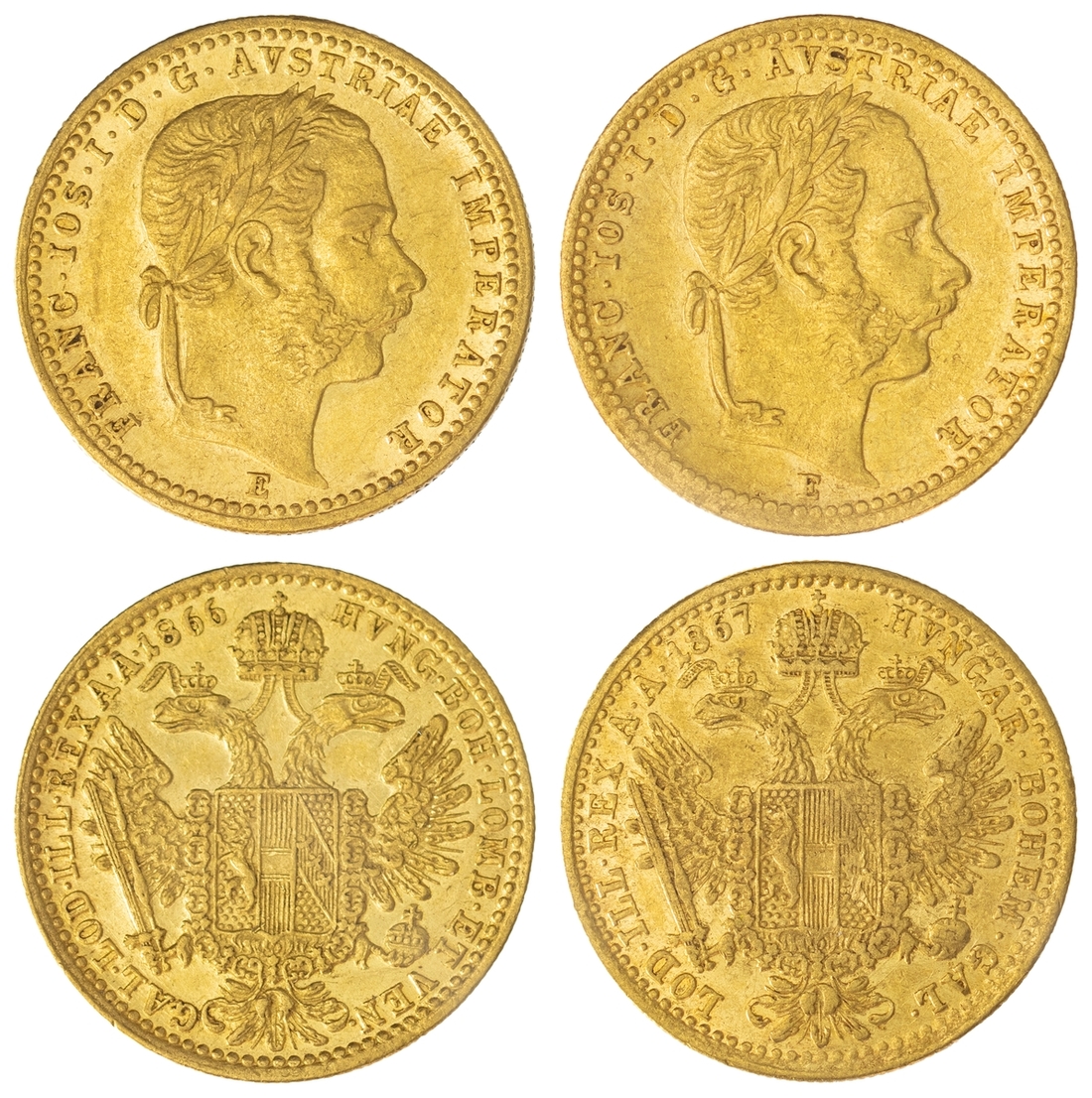 (g) Austrian Empire, Francis Joseph (1848-1916), Ducat, 1866 E, Alba Lulia, older laureate bust right, rev. crowned imperial eagle, edge milled, 3.45g, 12h (KM 2265; Fb. 233), some wispy hairlines, with a handsome lustre, extremely fine; another, Ducat, 1867 E, Alba Lulia, edge milled, 3.54g, 12h (KM 2265; Fb. 233), very fine (2)