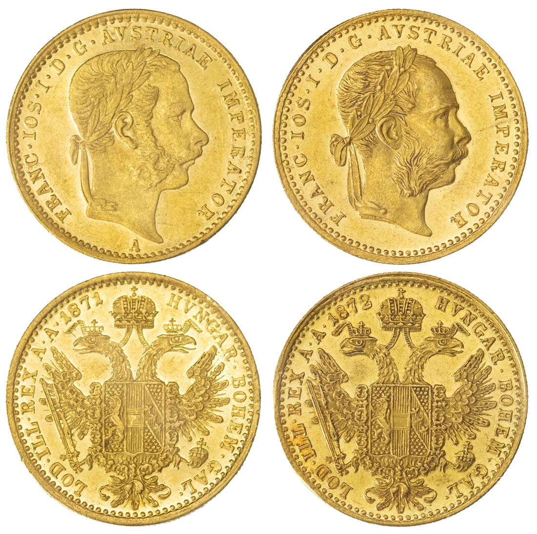 (g) Austrian Empire, Francis Joseph (1848-1916), Ducat, 1871 A, Vienna, older laureate bust right, rev. crowned imperial eagle, edge milled, 3.47g, 12h (KM 2266), wispy hairlines, lustrous, extremely fine; another, Ducat, 1872, edge milled, 3.48g, 12h (KM 2267), some wispy hairlines, with a handsome and flashy lustre, extremely fine (2)