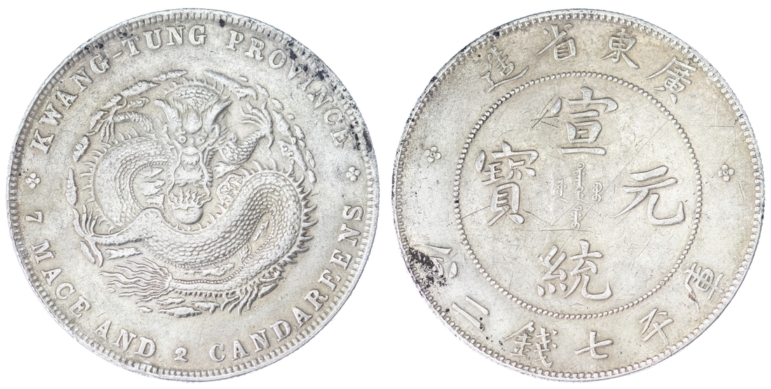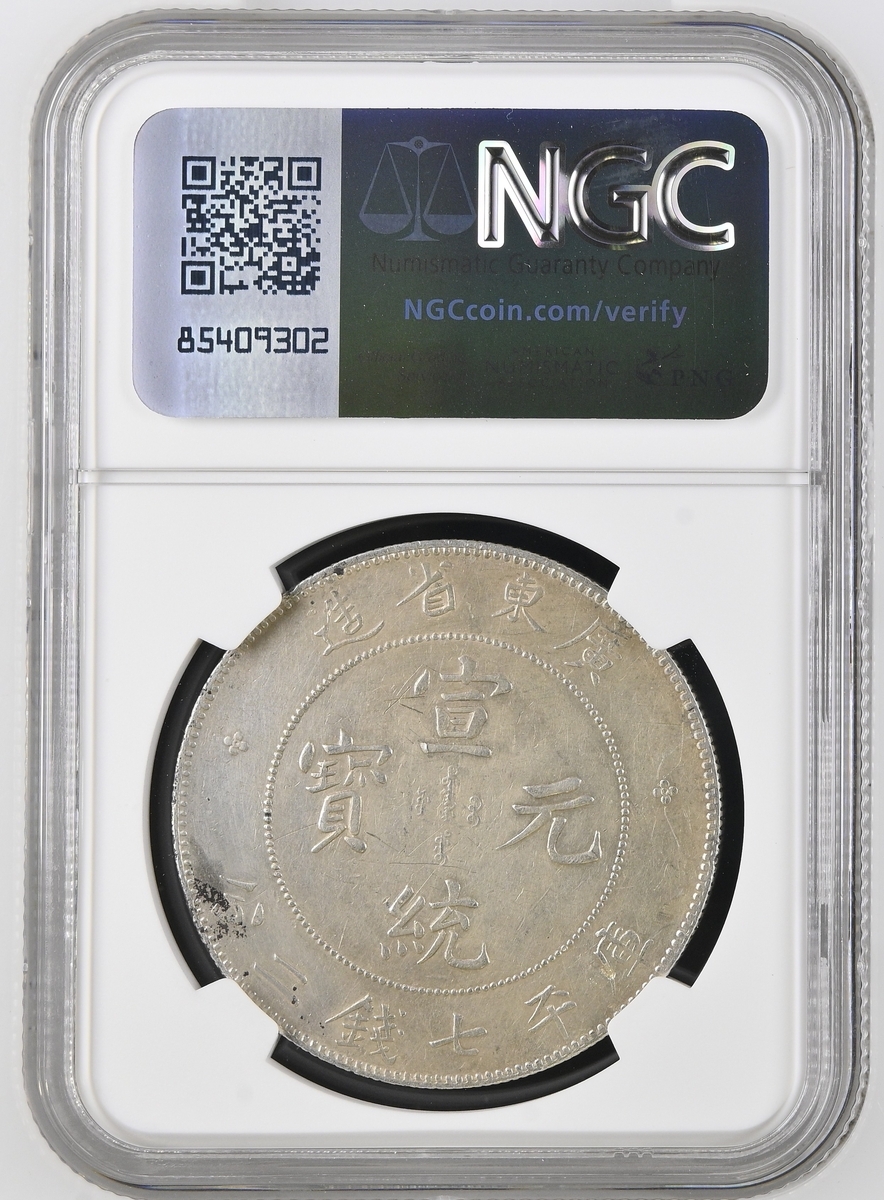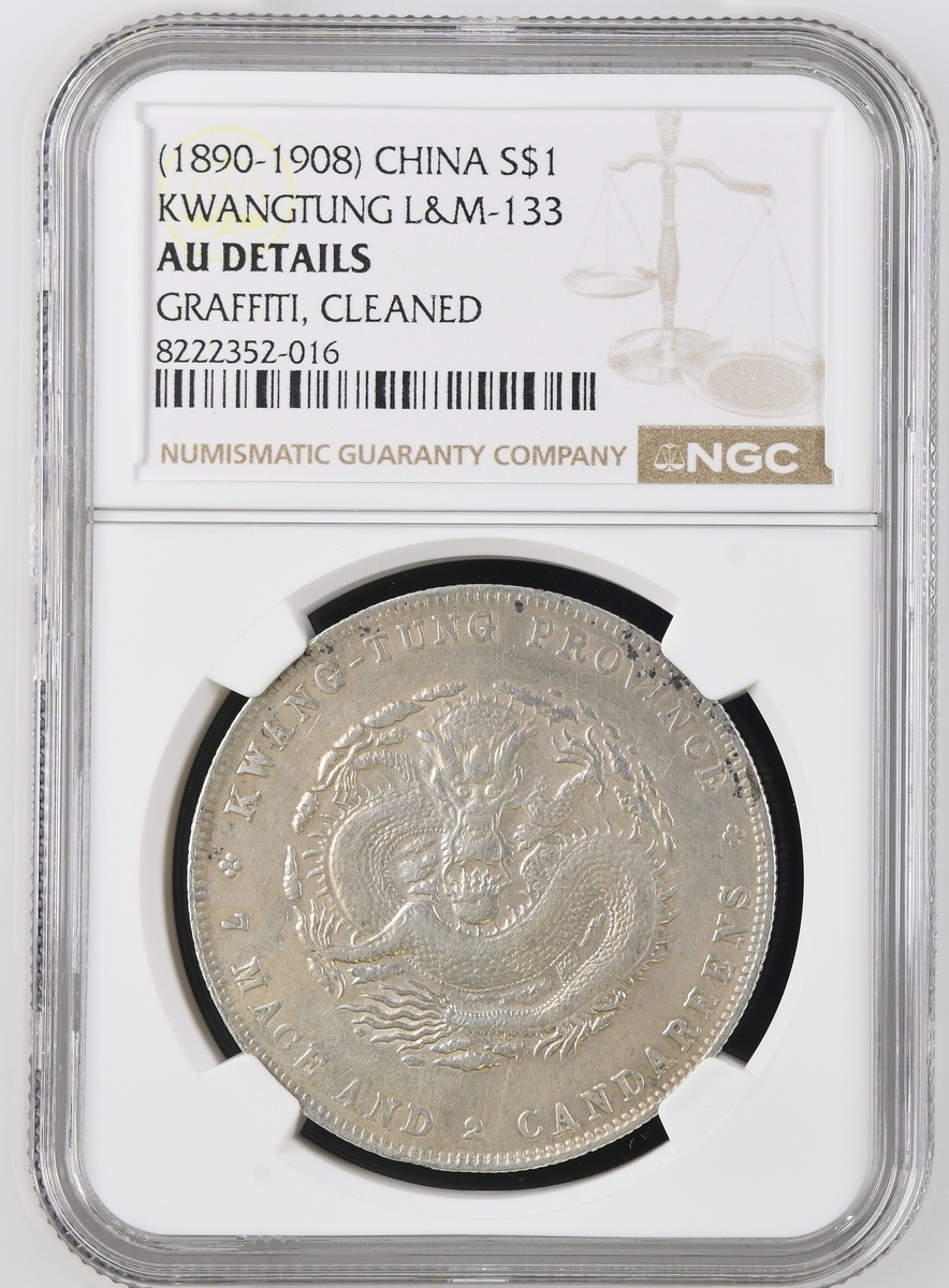 (x) NGC AU | China, Kwangtung, 7 Mace 2 Candareens (Dollar), 1890-1908, Kwangtung, 5.27 (L&M-133; K-26; KM-Y-203; WS-0942), cleaned, black deposit, scratches, and graffiti on the reverse, desired issue, in NGC holder, graded AU Details ~ Graffiti, Cleaned (Cert. #8222352-016)