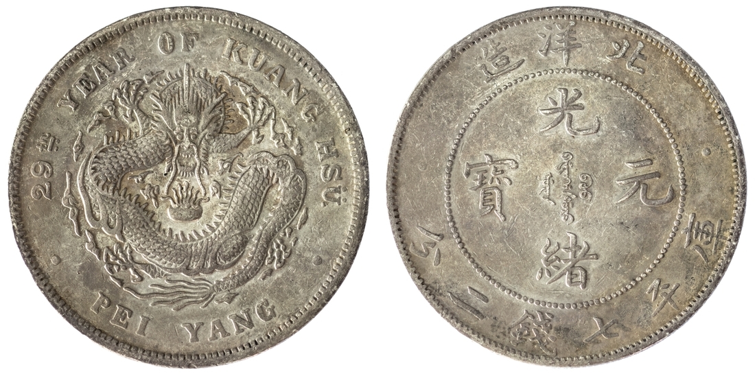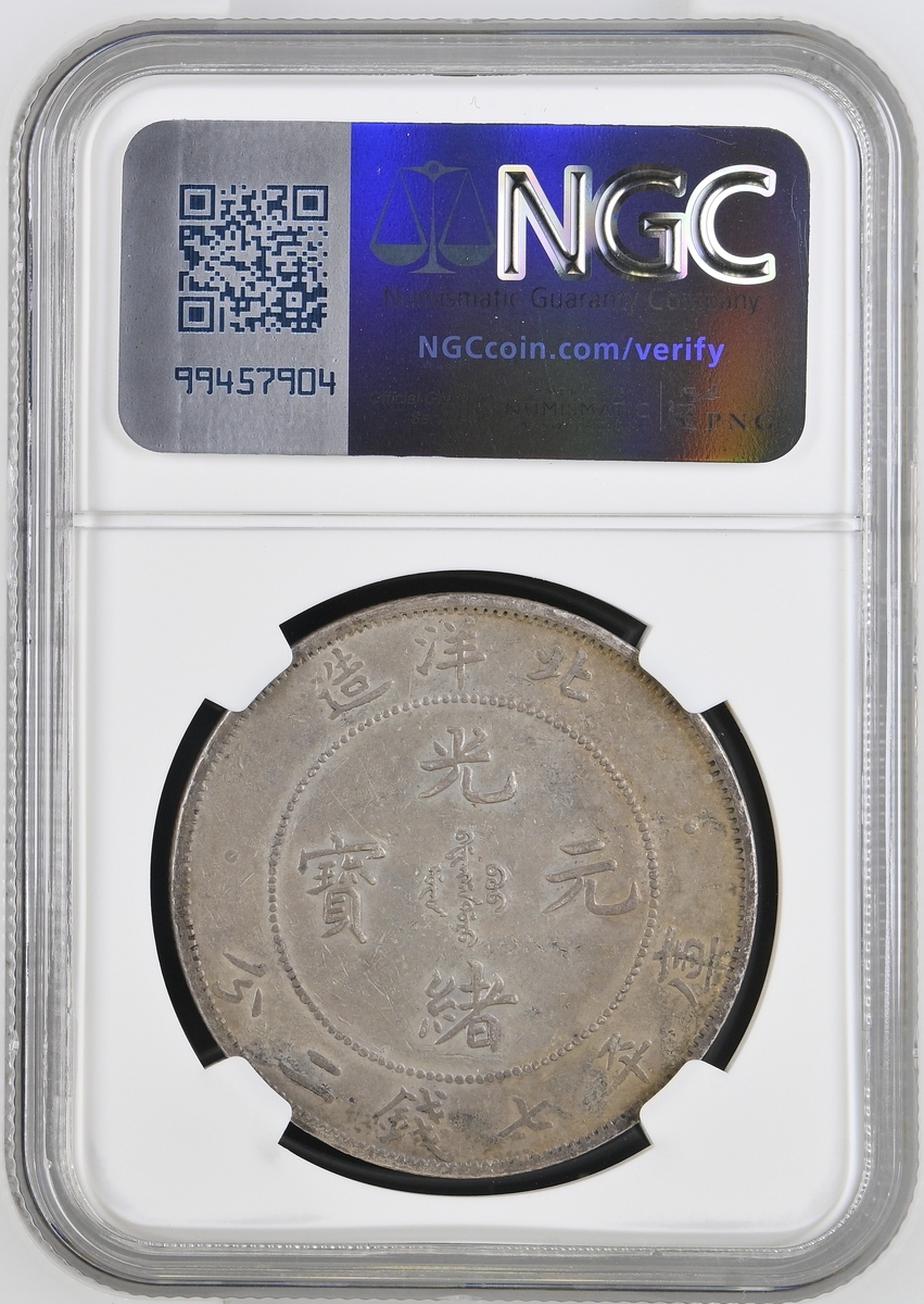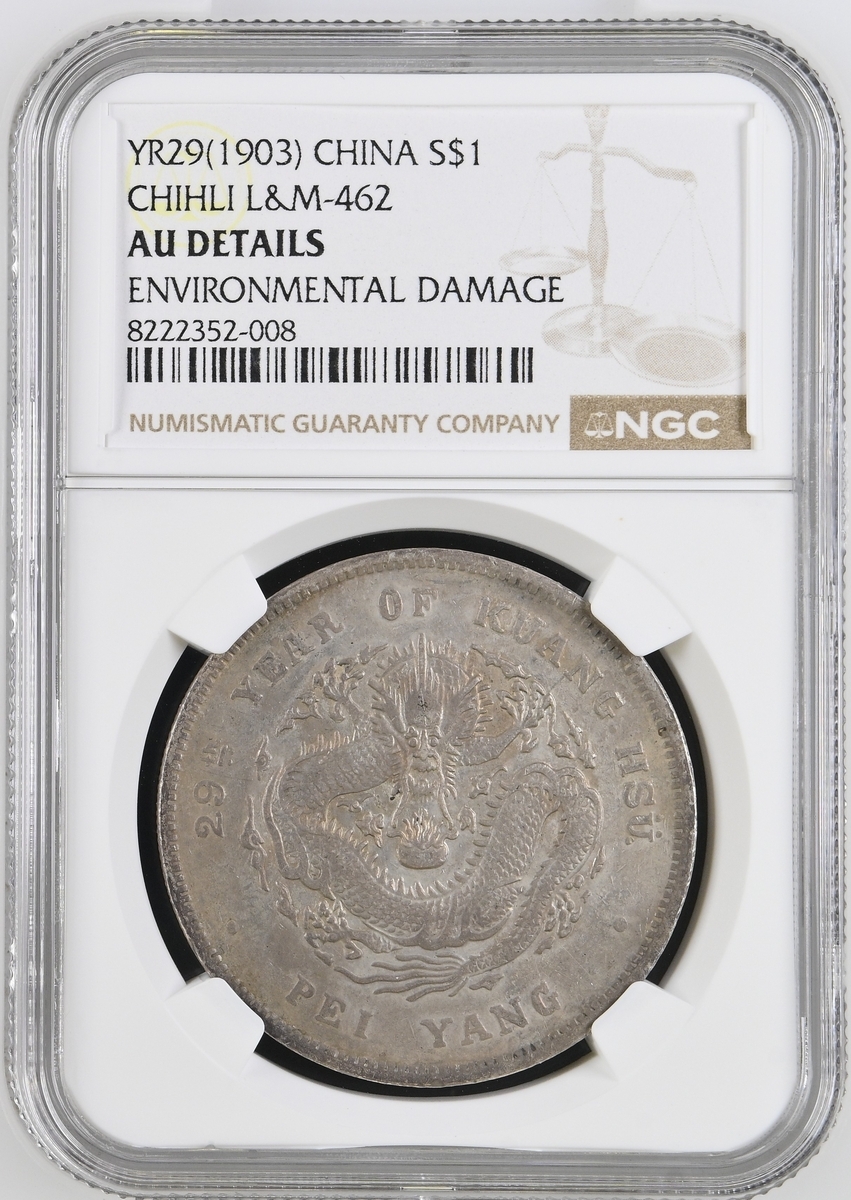 (x) NGC AU | China, Chihli (Pei Yang), 7 Mace 2 Candareens (Dollar), Year 29 (1903), without stop after YANG, 26.56g (L&M-462; KM Y#73.1), an always popular provincial type, bagmarks, toned, fine, in NGC holder, graded AU Details ~ Environmental Damage (Cert. #8222352-008)
