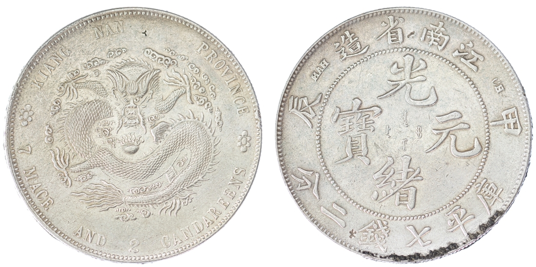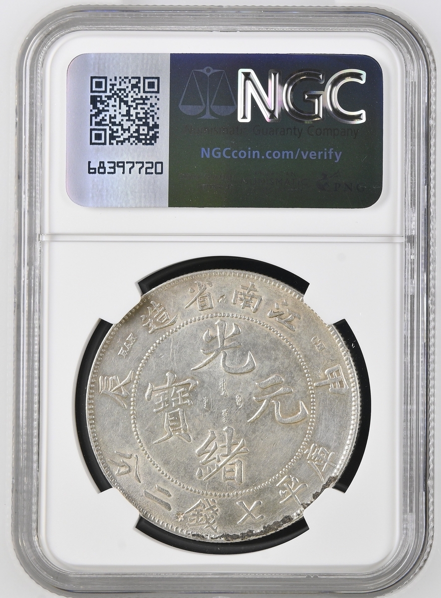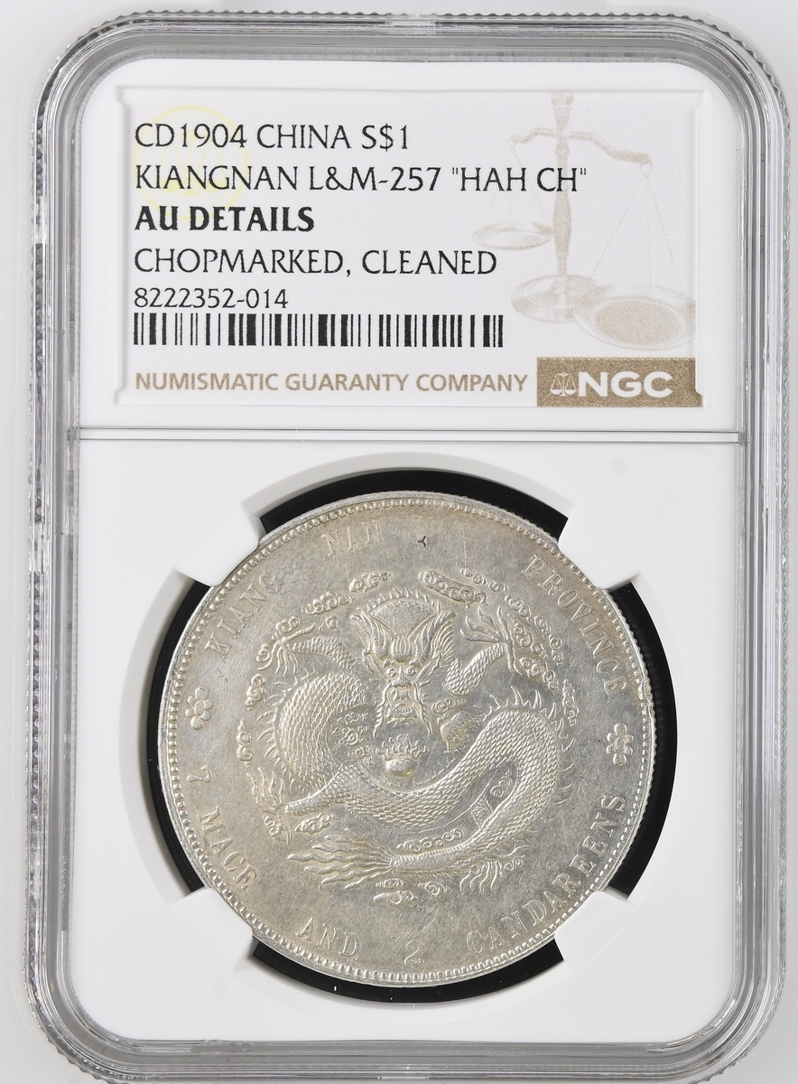 (x) NGC AU | China, Kiangnan, 7 Mace, 2 Candareens (Dollar), CD-1904, 'HAH CH', 26.87g (L&M-257), chopmarked and bruised, dark deposit on the reverse, cleaned, lightly worn and toned, very fine, in NGC holder, graded AU Details ~ Chopmarked, Cleaned (Cert. #8222352-014)