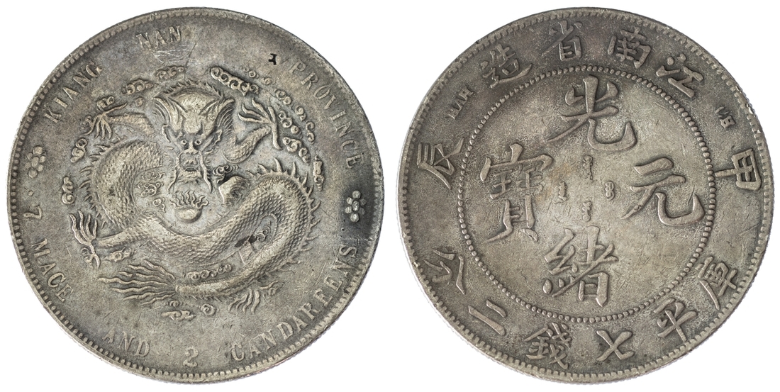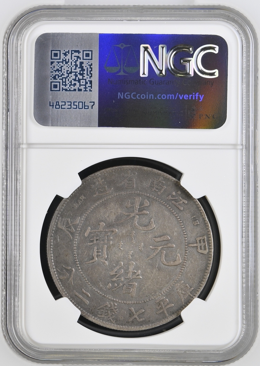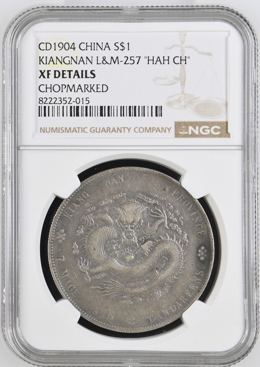 (x) NGC XF | China, Kiangnan, 7 Mace, 2 Candareens (Dollar), CD-1904, 'HAH CH', 26.61g (L&M-257), chopmarked, scuffed and worn to the higher devices, patchy dark toning, better than fine, in NGC holder, graded XF Details ~ Chopmarked (Cert. #8222352-015)