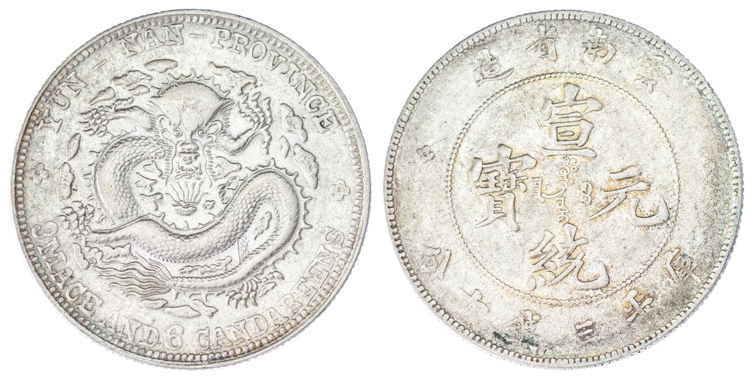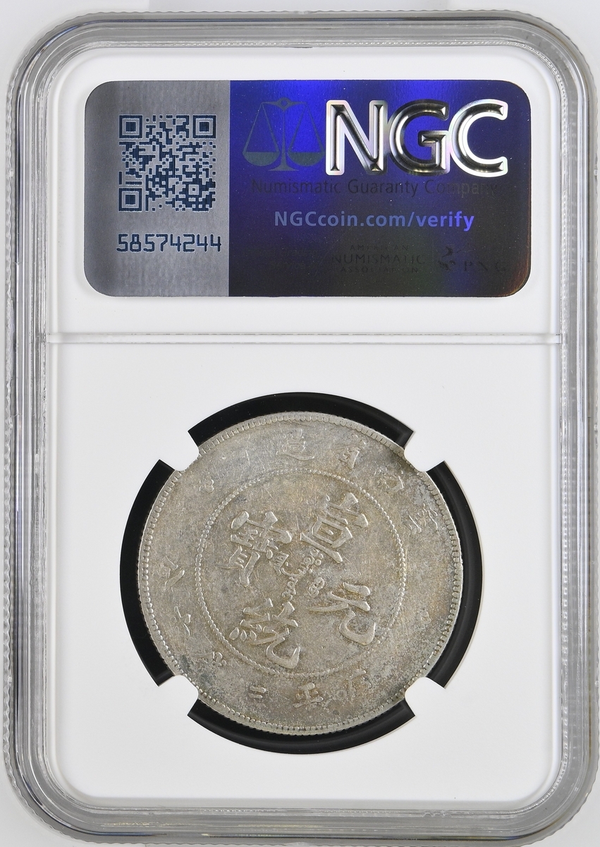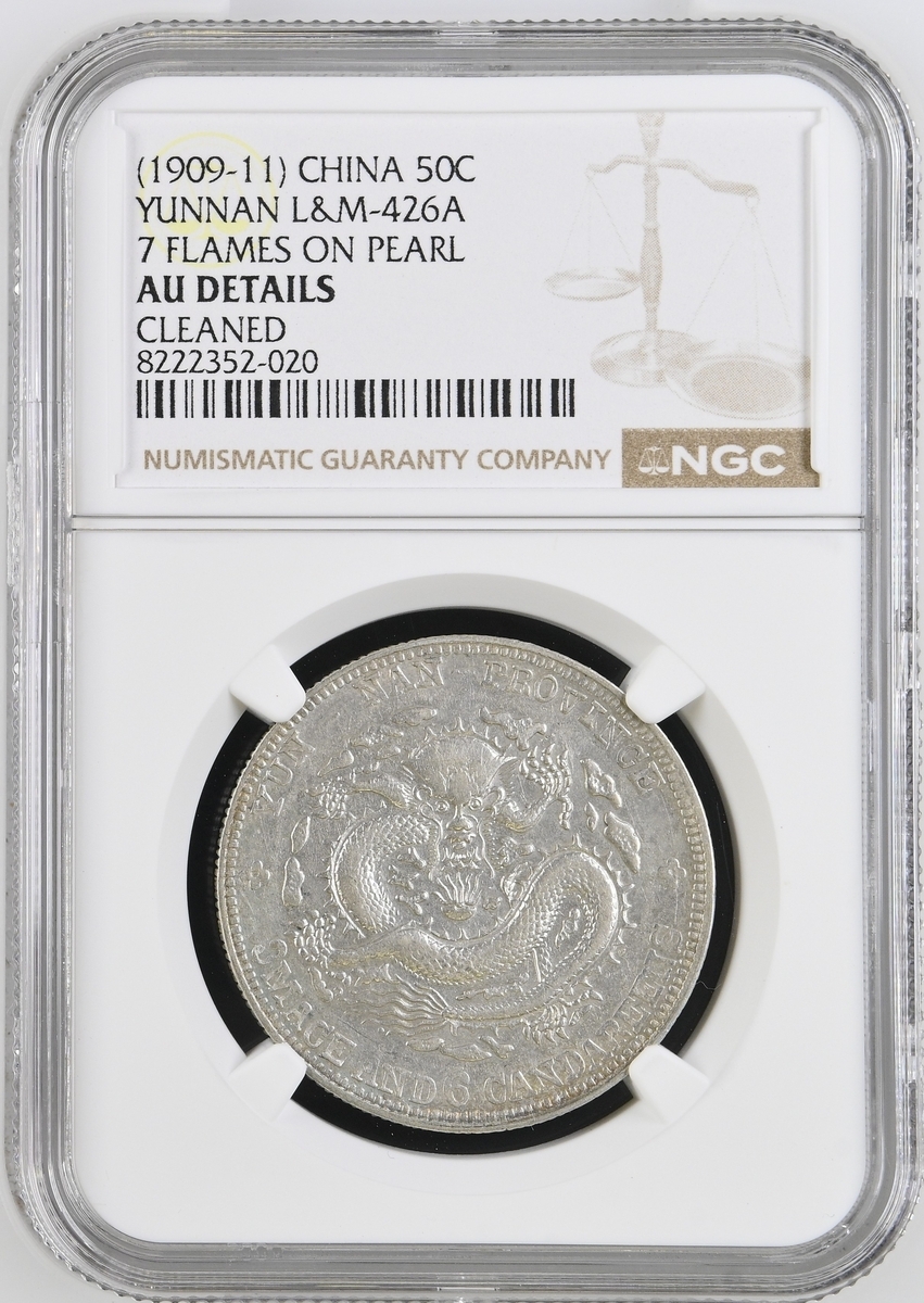 (x) NGC AU | China, Yunnan, 3 Mace 6 Candareens (50 Cents), 1909-1911, 7 flames on pearl, 25.80g (L&M-426A; Y #259), cleaned, slightly flattened details, fine, in NGC holder, graded AU Details ~ Cleaned (Cert. #8222352-020)