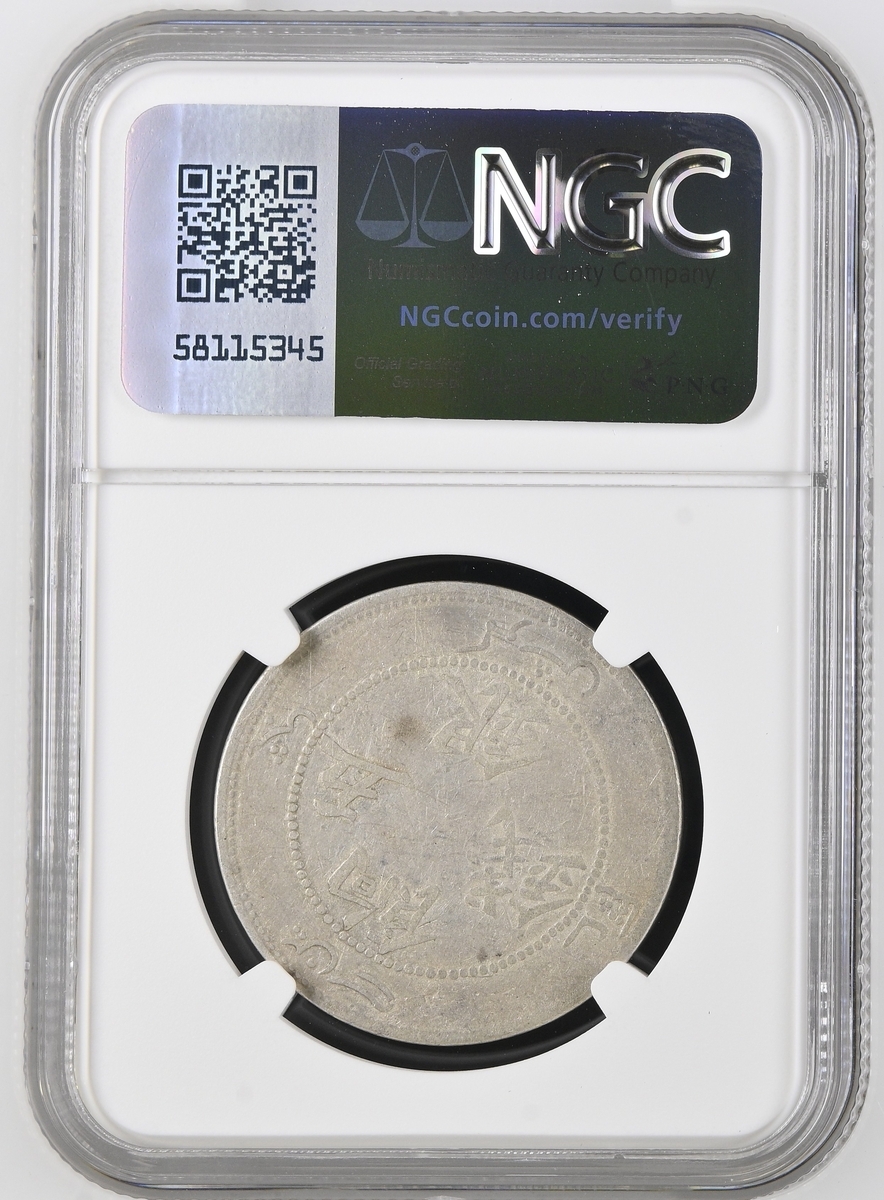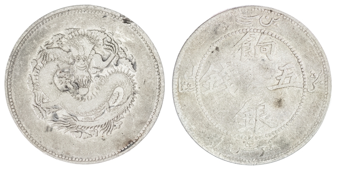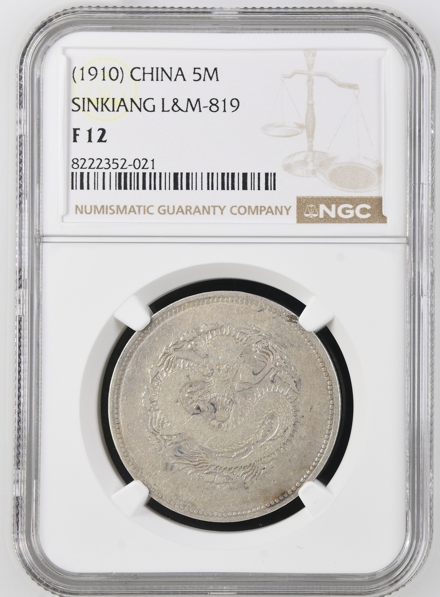 (x) NGC F12 | China, Sinkiang 5 Mace (Miscals), ND 1910, no circle around the dragon, 13.88g (L&M-819; K-1013; KM-Y-6.1), ration coinage quite worn and largely flattened details but a desirable issue nonetheless, in NGC holder, graded F12 (Cert. #8222352-021)