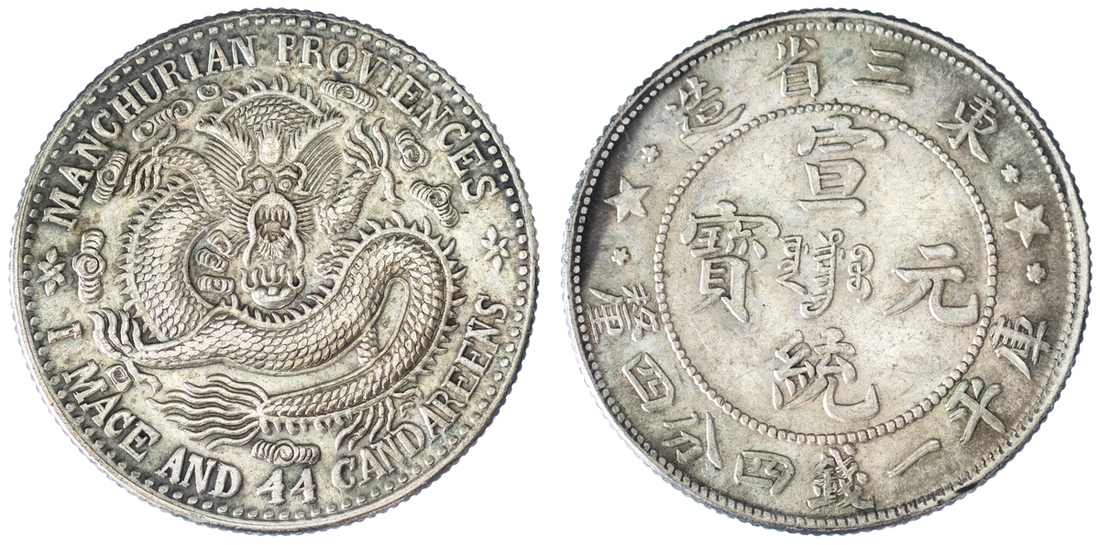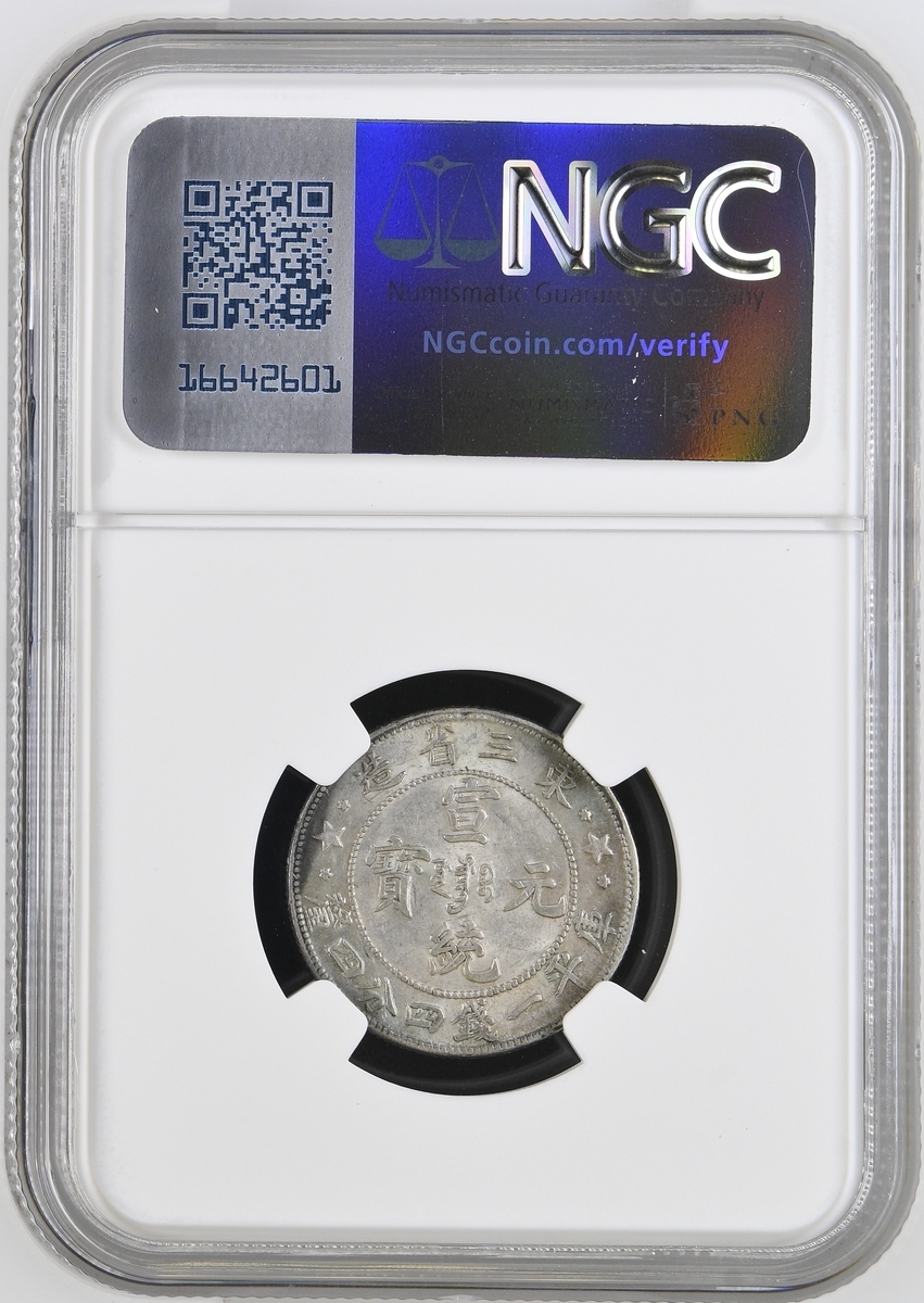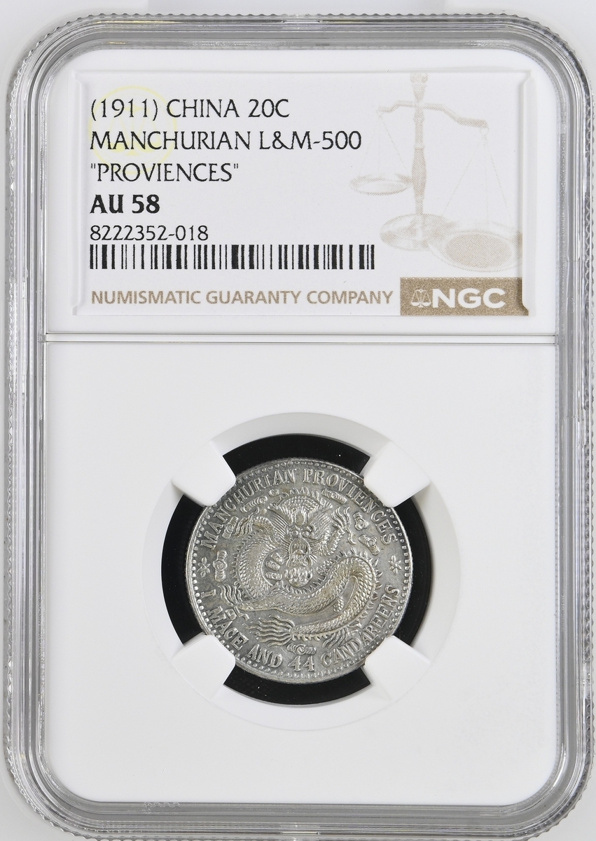 (x) NGC AU58 | China, Manchurian Provinces, 20 Cents, 1911, "Proviences" spelling variety, 5.32g (KM-Y213a, L&M-500), toned, bold with little wear, very fine, in NGC holder, graded AU58 (Cert. #8222352-018)