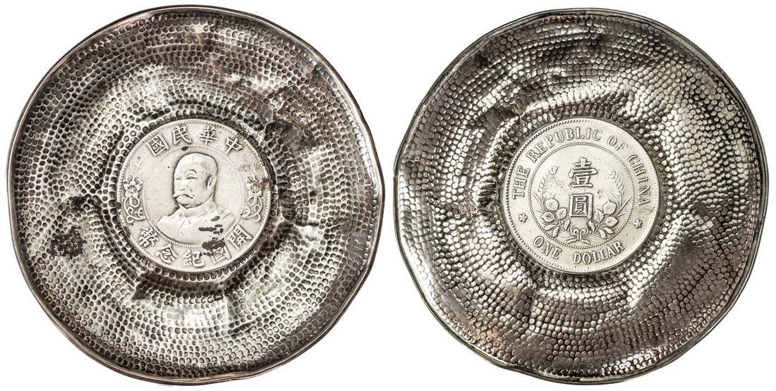 China, Republic, Li Yuan-hung, AR Dollar, 1912, on the Founding of the Republic, uniformed bare-head bust half left, inscription around divided by floral sprays, rev. inscription above floral wreath (KM Y321), coin mounted in small silver bowl with punch details, the coin itself worn and cleaned, but an interesting piece nonetheless and an accessible opportunity to own this coveted specimen