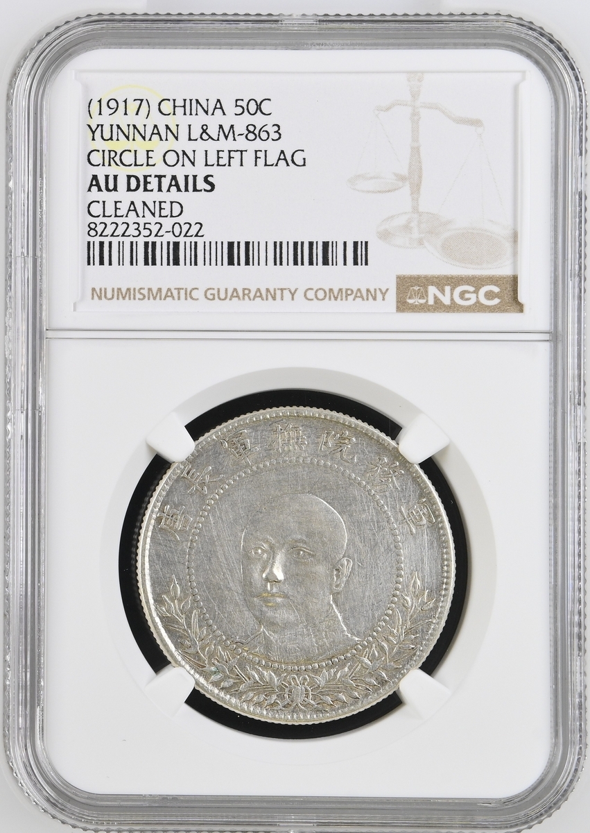 (x) NGC AU | China, Yunnan 3 Mace 6 Candareens (50 Cents), ND (1917), Kunming, 13.33g (L&M-863; K-673; KM-Y-479.1), cleaned, with flattened details at the higher points, but otherwise good fine, in NGC holders, graded AU Details ~ Cleaned (Cert. #8222352-022)