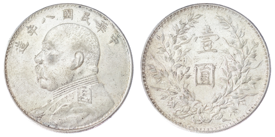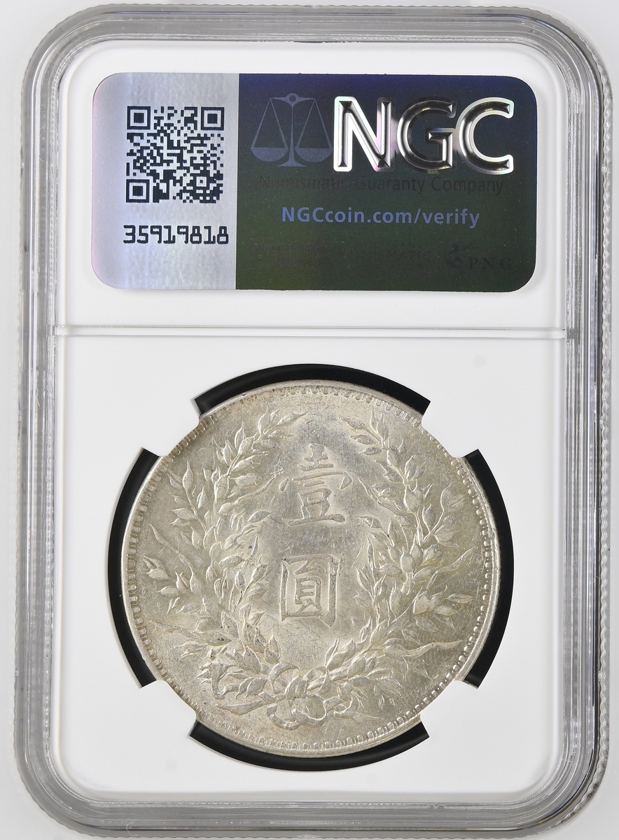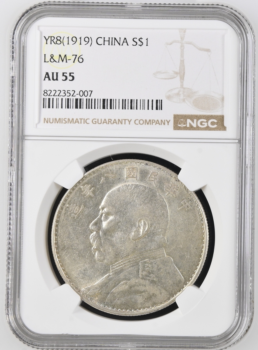 (x) NGC AU55 | China, Republic, Dollar, Year 8 (1919), Yuan Shih-kai bust left, upper part of "hua" not connected, 26.84g (L&M 76; KM Y#329.6), a rare and desired variety of this KEY DATE, some light bagmarks, near very fine, in NGC holder, graded AU55 (Cert. #8222352-007)