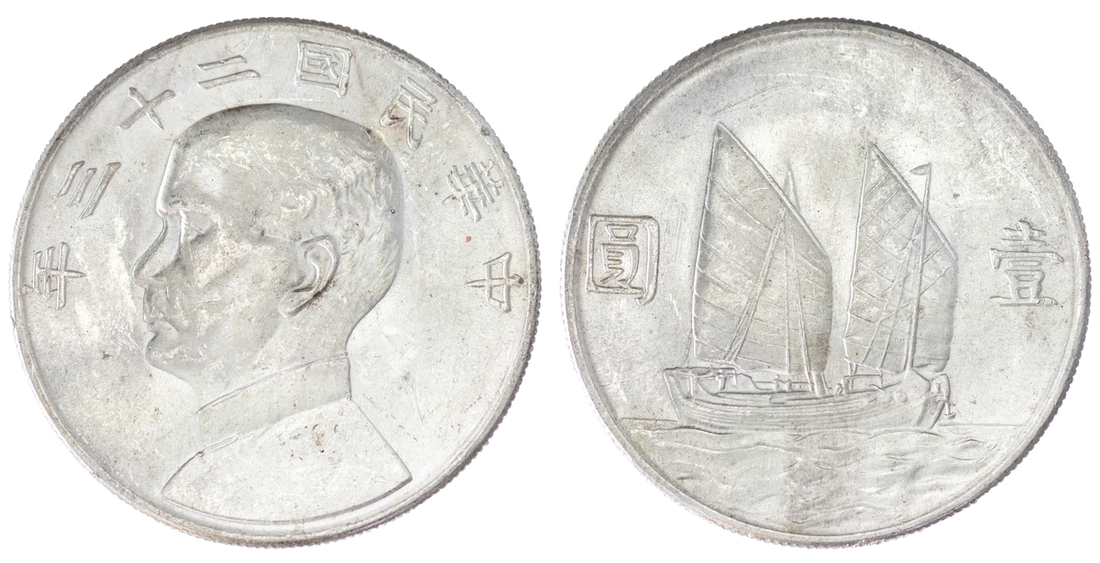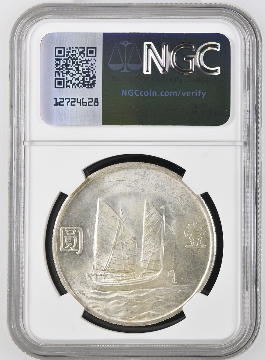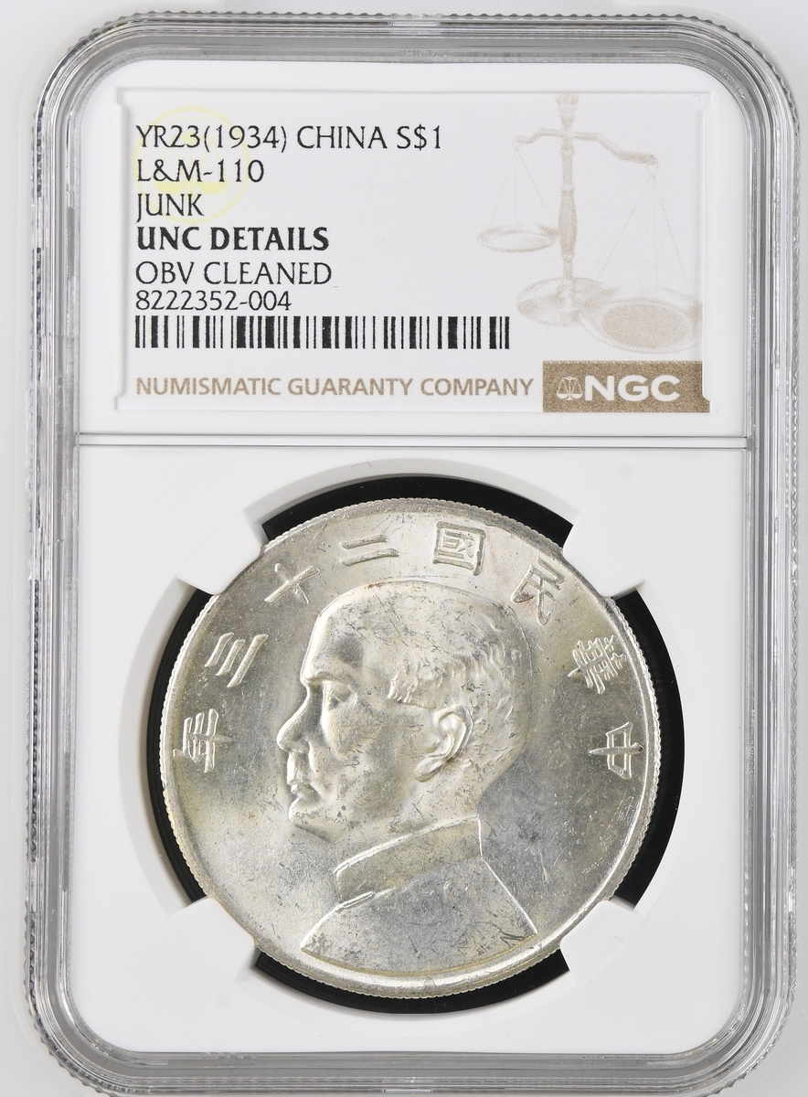 (x) NGC UNC | China, Republic, Dollar, 1934, Sun Yat-sen left, rev. two-masted Junk ship sailing right, without sun and birds, edge reeded, 26.63g (L&M 110), some light friction marks, bagmarks, very harshly graded by NGC, with cartwheel lustre, near extremely fine, in NGC holder, graded UNC Details ~ Obv Cleaned (Cert. #8222352-004)
