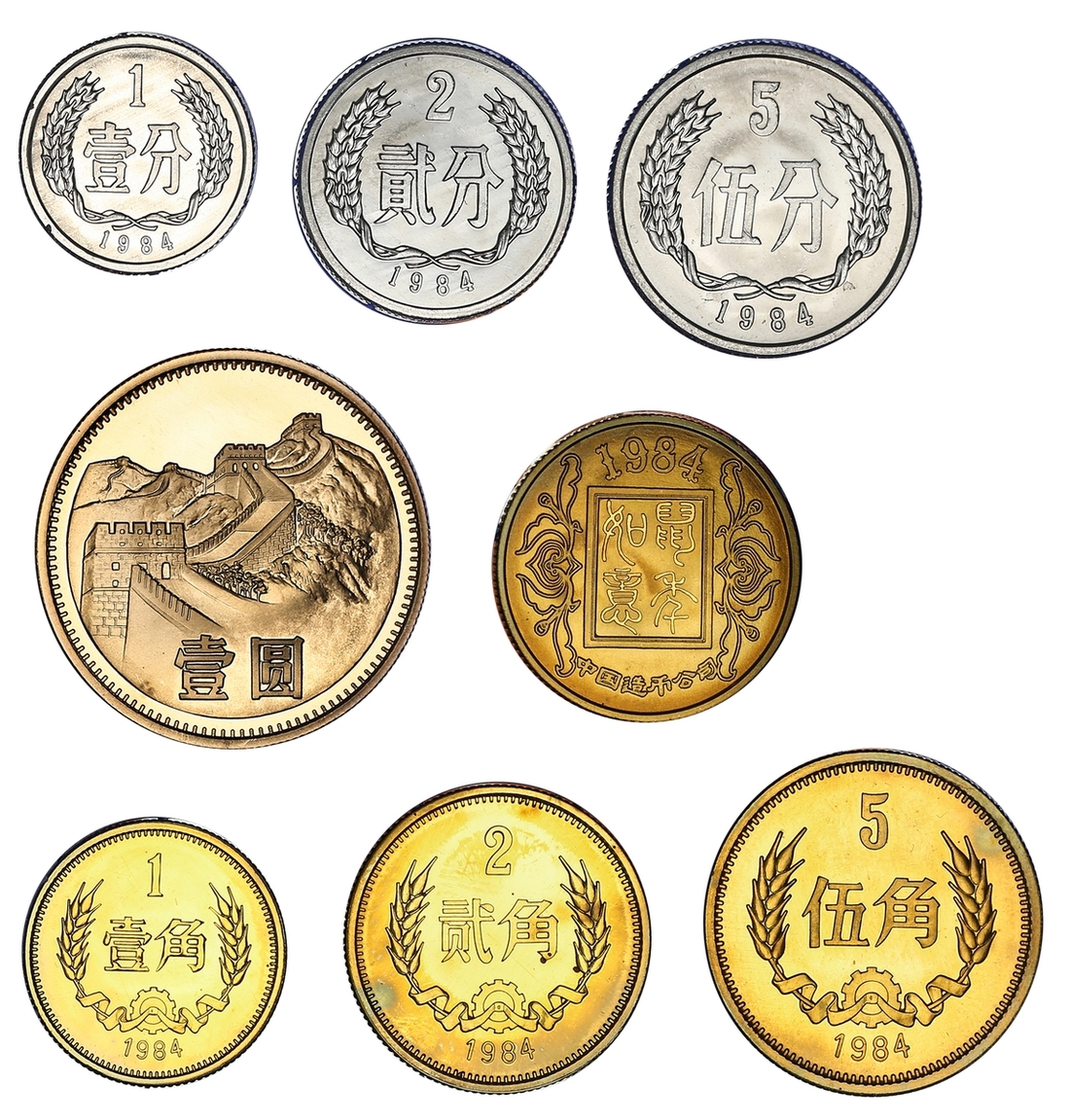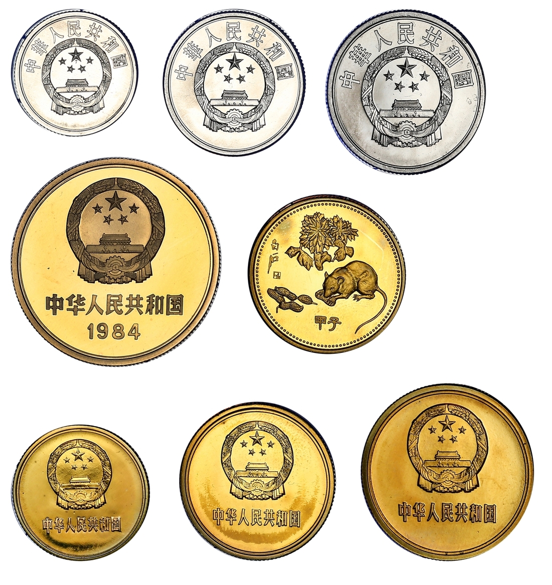 (x) China, Republic, Circulation Proof Set of 'China Coins', 1984 (8), by China Mint Company, Shanghai, 1 Fen; 2 Fen; 5 Fen; 1 Jiao; 2 Jiao; 5 Jiao; 1 Yuan and 'Year of the Rat' Medal (KM PS12), sealed in plaster holder with paper wrap, uncirculated (8)
