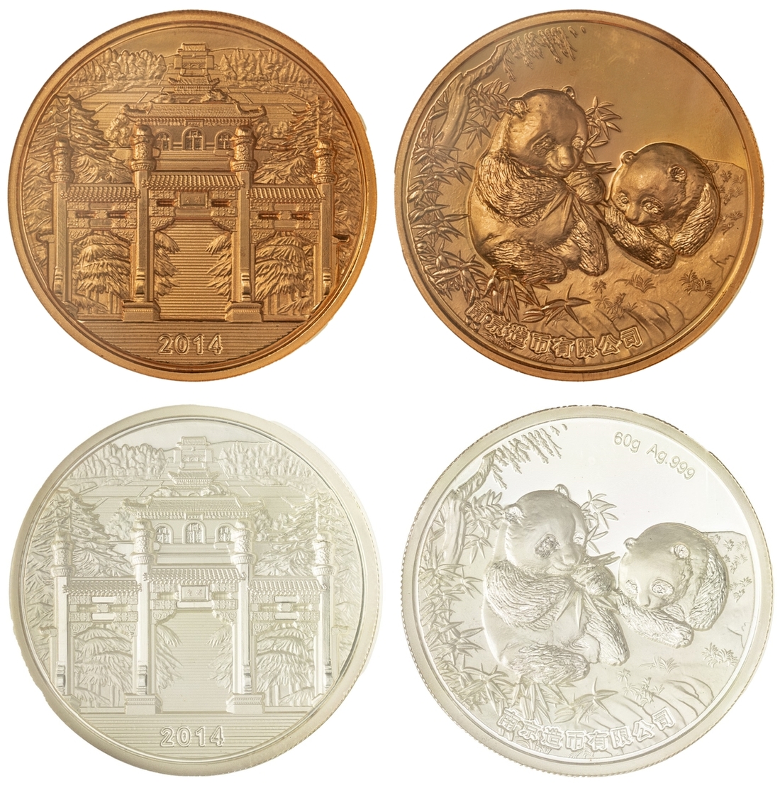 NGC PF69 ULTRA CAMEO | China, Republic, Official Panda Medal Series, 'Two Lovely Pandas', 2014, by Nanjing Mint (2), Brilliant Silver Proof, issued October 2014, Pair of Pandas in Bamboo Forest, rev. vista of Zhongshan Mountain National Park with Sun Yat-Sen's Gate and Mausoleum in foreground and background, edge milled, .999 Fine Silver, 60g, 45mm., 12h brilliant, as struck, from a small mintage of only 380 pieces, accompanied by Certificate of Authenticity (#125), in NGC holder, graded PF69 ULTRA CAMEO (Cert. #3878131-018); another, Brilliant Copper Proof, issued May 2014, as before, edge milled, 45mm., 12h brilliant, as struck, from a small mintage of only 199 pieces, accompanied by Certificate of Authenticity (#090), in NGC holder, graded PF69 RD ULTRA CAMEO (Cert. #3877849-012), with Mint Cases of Issue (2)