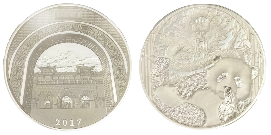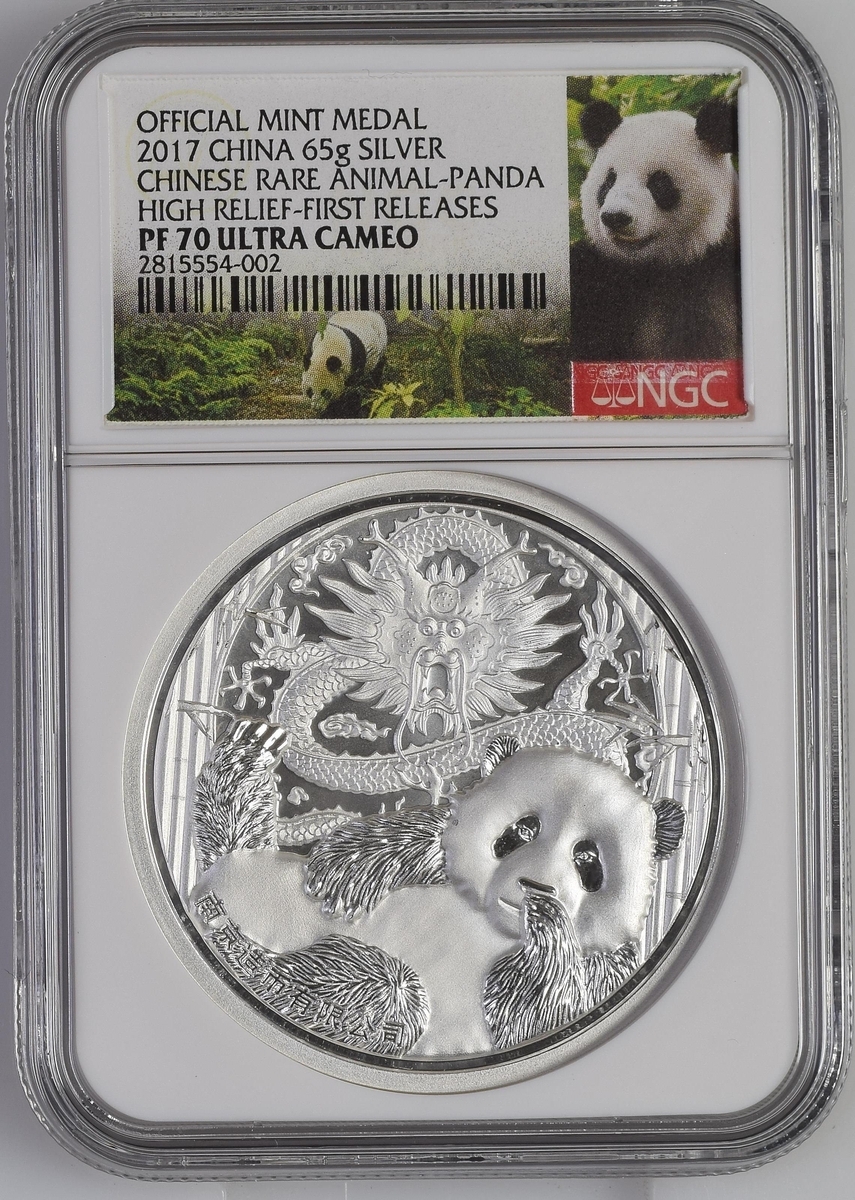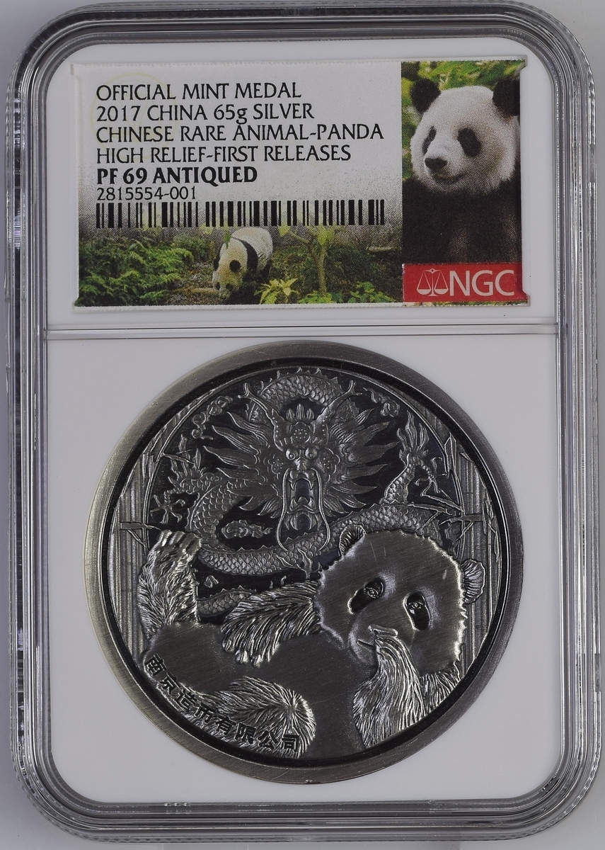 NGC PF70 ULTRA CAMEO | China, Republic, Official Proof Silver Medal, 'Chinese Rare Animal-Panda', 2017, in high relief, 12h brilliant, as struck, in NGC holder, graded PF70 ULTRA CAMEO [*First Releases*] [*Joint Finest Certified*] (Cert. #2815554-002); another, NGC PF69 ANTIQUED | China, Republic, Official Proof Silver Medal, 'Chinese Rare Animal-Panda', 2017, in high relief, 12h as struck, in NGC holder, graded PF69 ANTIQUED [*First Releases*] (Cert. #2815554-001) (2)