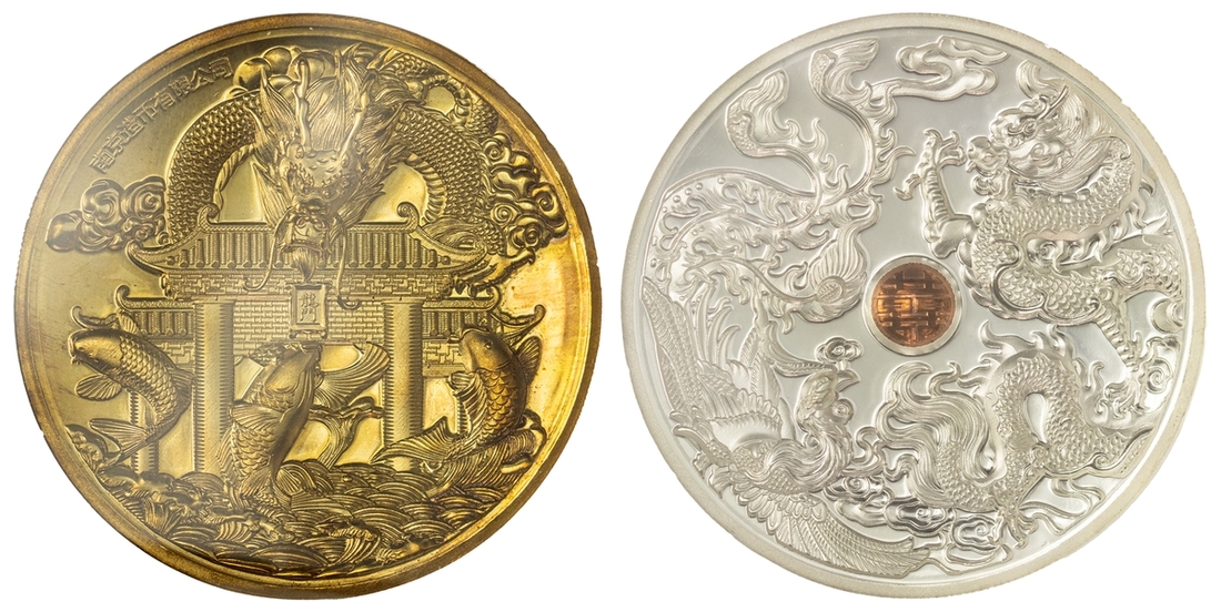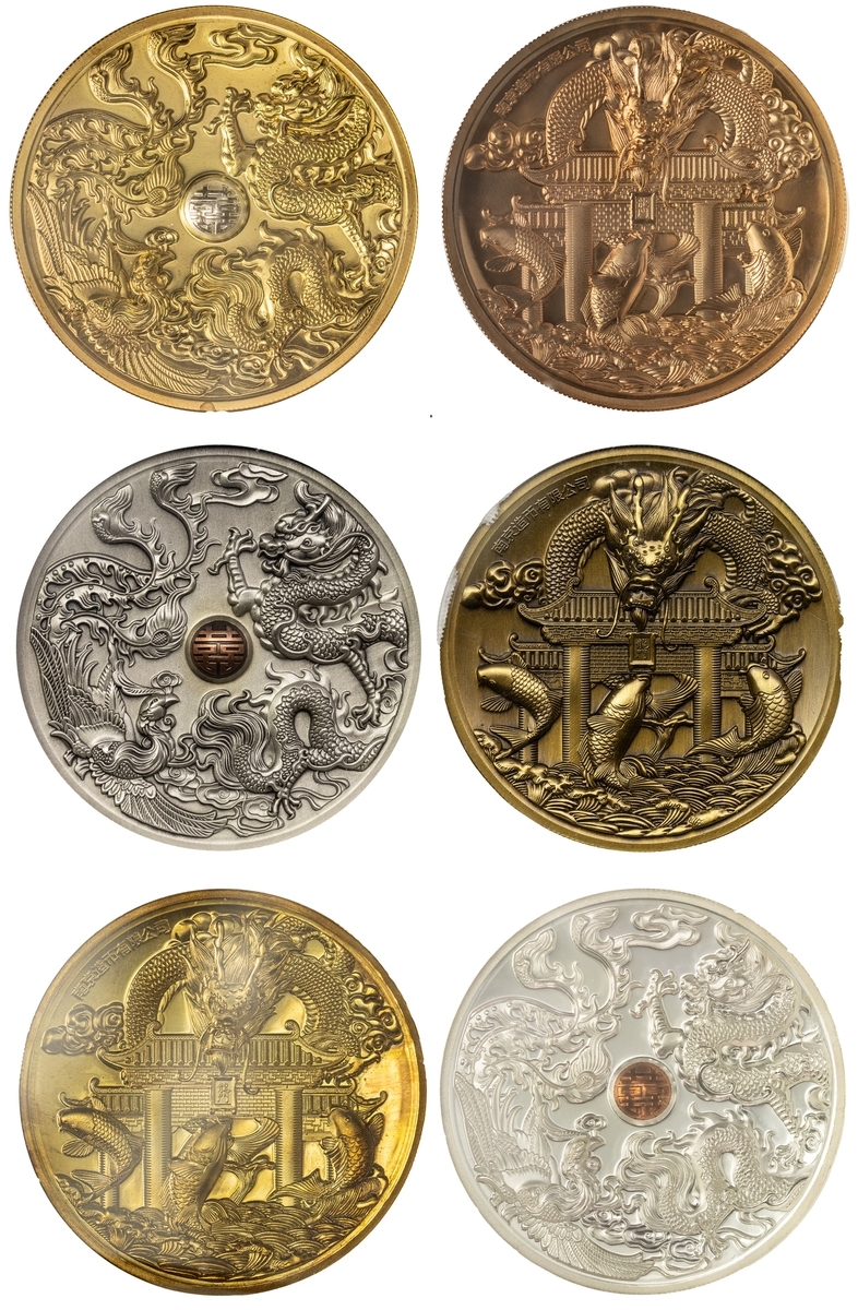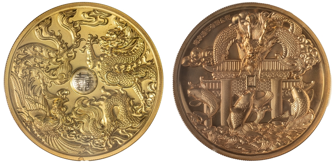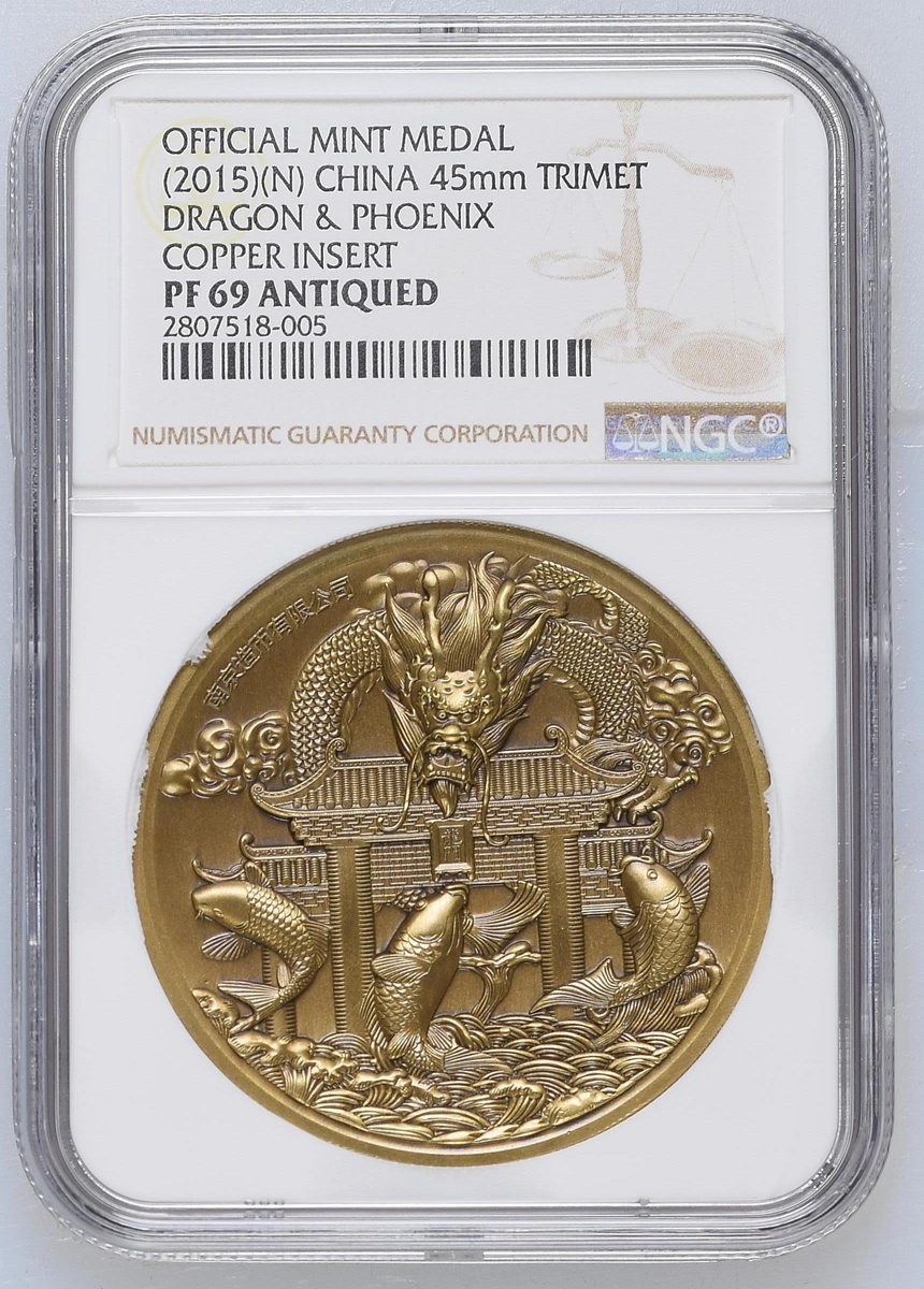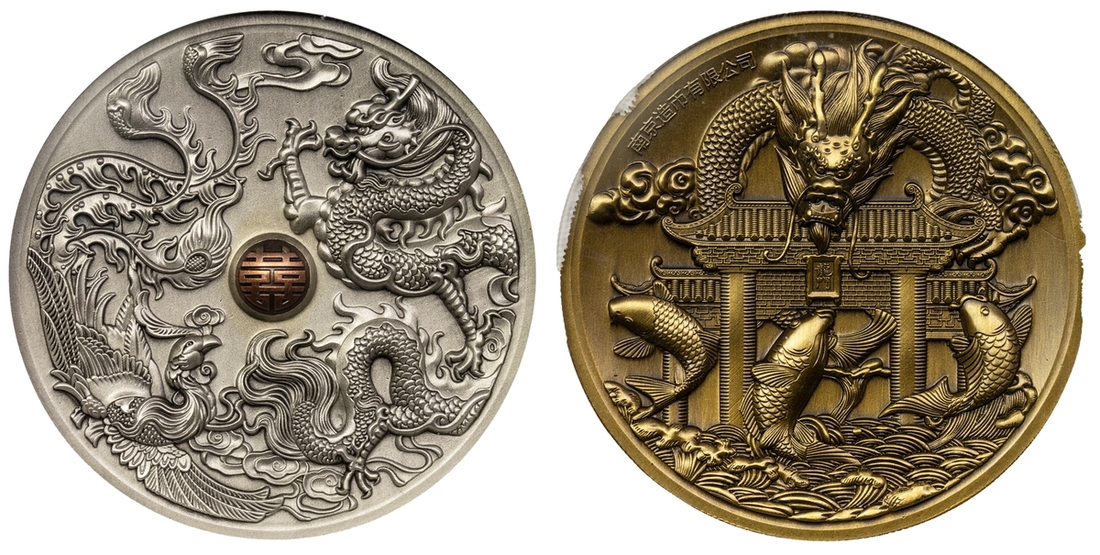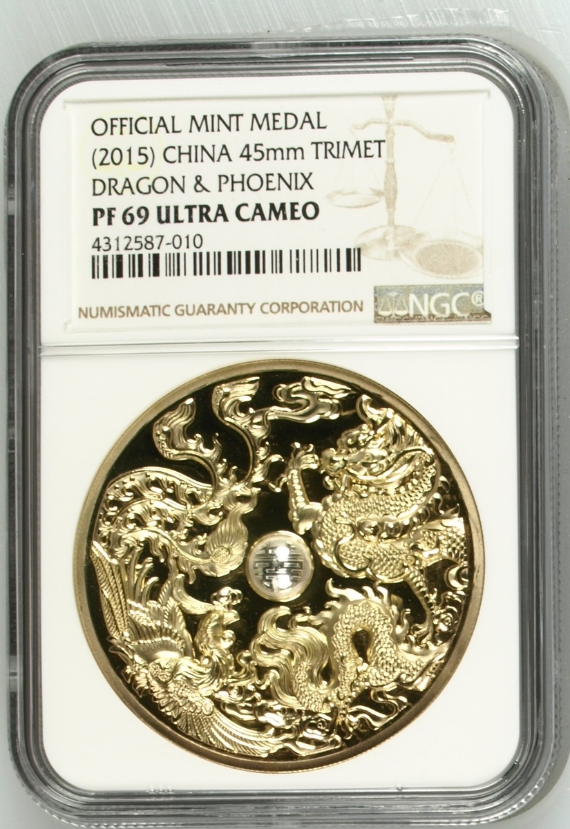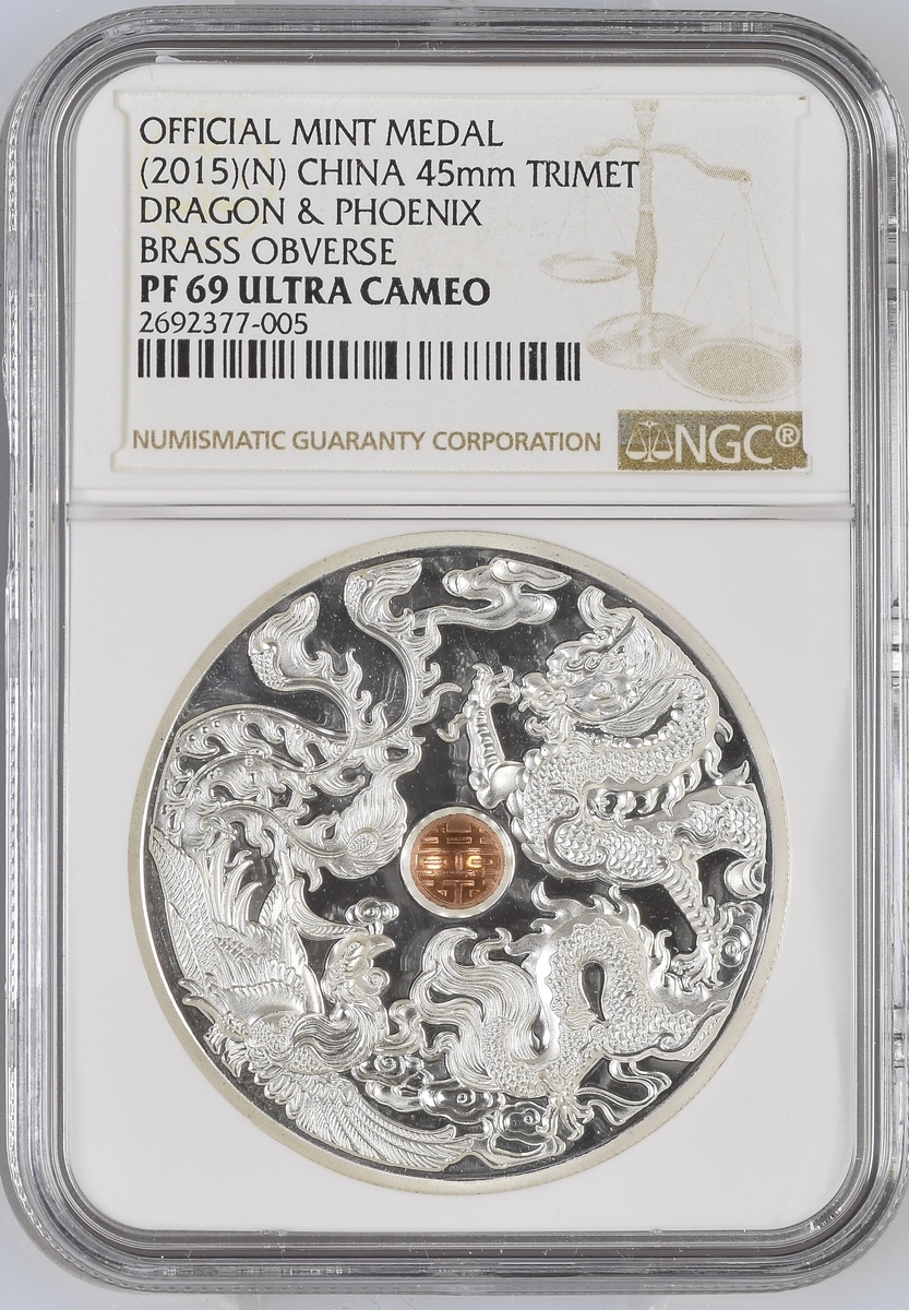 NGC PF69 | *Top Pop* | China, Republic, Lunar Medal Series, 'Dragon and Phoenix', 2015 (3), brass obverse, 12h, brilliant, as struck, in NGC holder, graded PF69 ULTRA CAMEO (Cert. #2692377-005) [*Joint Finest Certified*]; another, NGC PF69 ULTRA CAMEO | China, Republic, Official Proof Medal, 'Dragon and Pheonix', 2015, 12h, brilliant, as struck, in NGC holder, graded PF69 ULTRA CAMEO (Cert. #4312587-010); another, NGC PF69 ANTIQUED | China, Republic, Official Proof Medal, 'Dragon and Pheonix', 2015, brass insert, 12h, choice, as struck, in NGC holder, graded PF69 ANTIQUED (Cert. #2807518-005) (3)