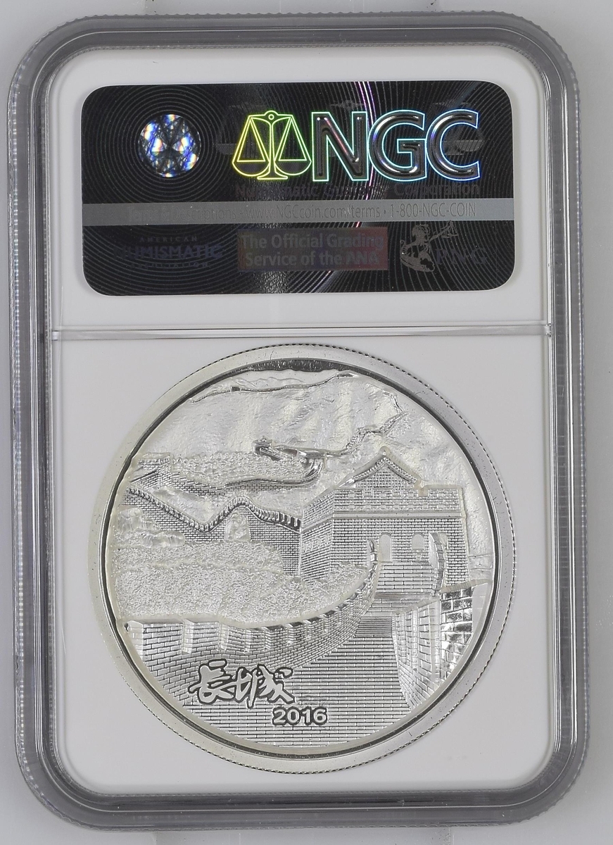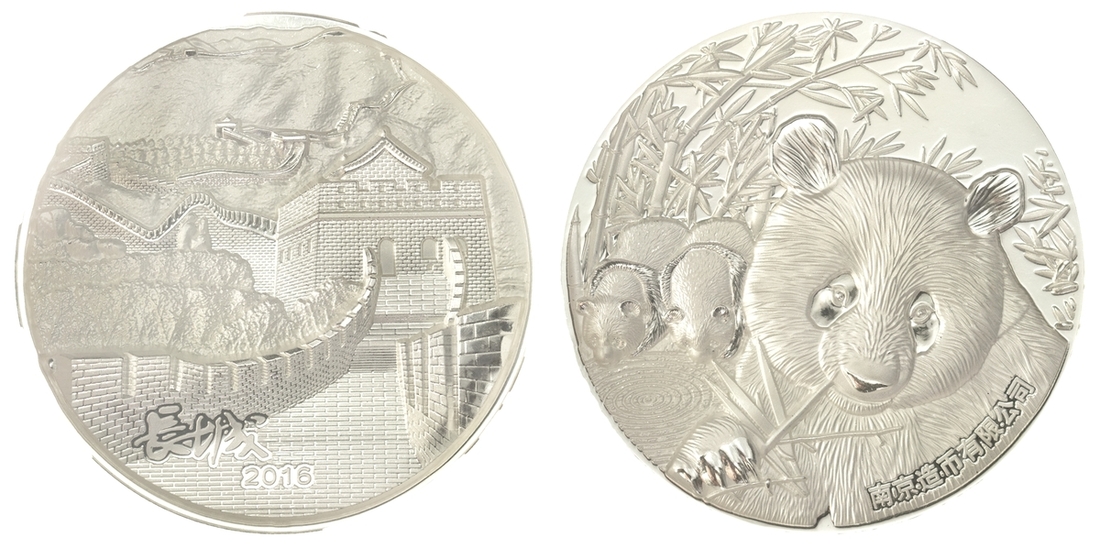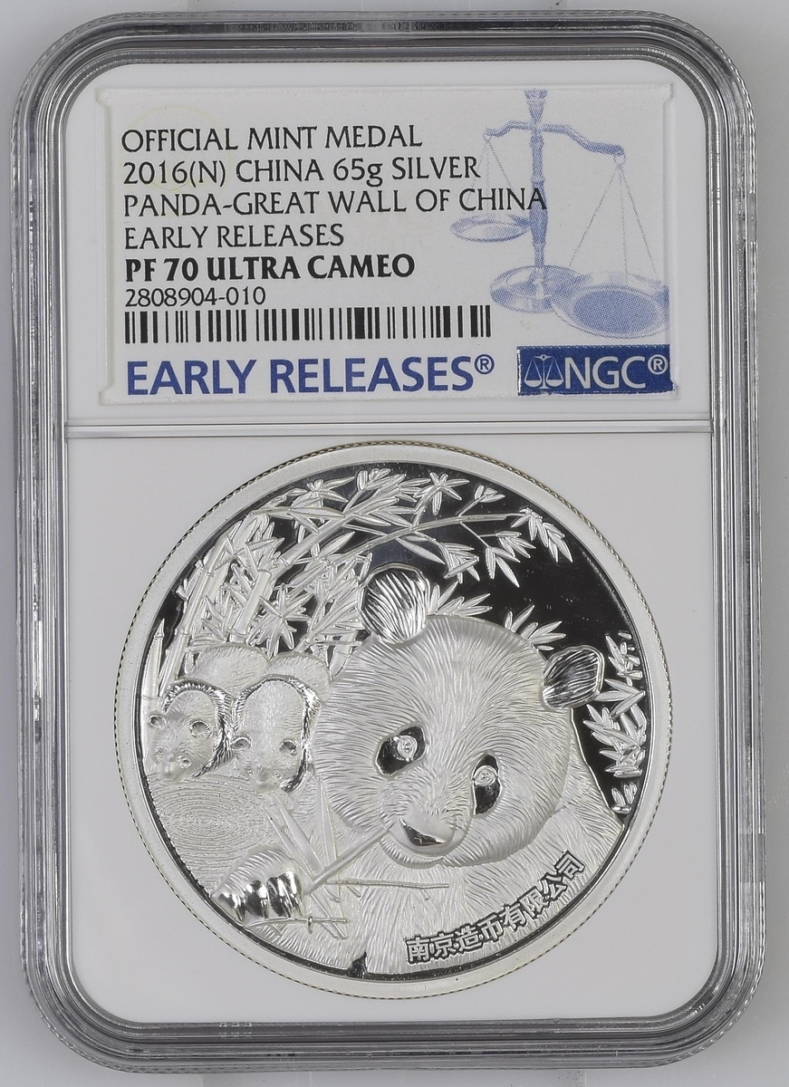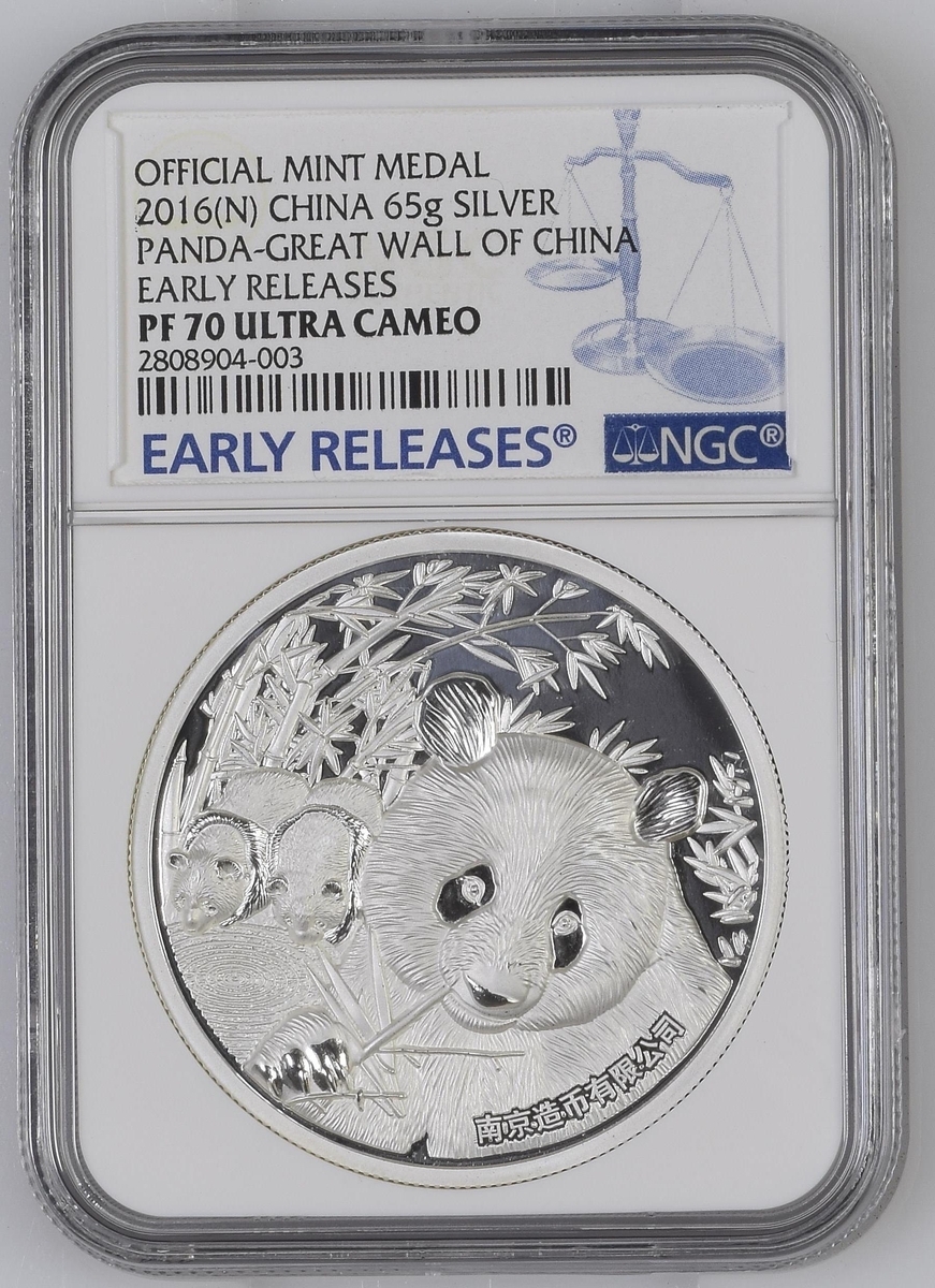 NGC PF70 ULTRA CAMEO | Early Releases | *Top Pop* | China, Republic, Official Panda Medal Series, 'Great Wall of China', 2016 Brilliant Silver Proofs, engraved by Cheng Chao and Li Rui for Nanjing Mint Co. Ltd (2), Great Wall of China, rev. edge milled, .999 Fine Silver, 65g, 12h, brilliant, as struck, from a mintage of only 199 pieces, accompanied by Certificate of Authenticity (#027), in NGC holder, graded PF70 ULTRA CAMEO (Cert. #2808904-003) [*Joint Finest Certified*]; another, as before, edge milled, .999 Fine Silver, 65g, 12h, brilliant, as struck, from a mintage of only 199 pieces, accompanied by Certificate of Authenticity (#093), in NGC holder, graded PF70 ULTRA CAMEO (Cert. #2808904-010) [*Joint Finest Certified*], with Mint Cases of Issue (2)