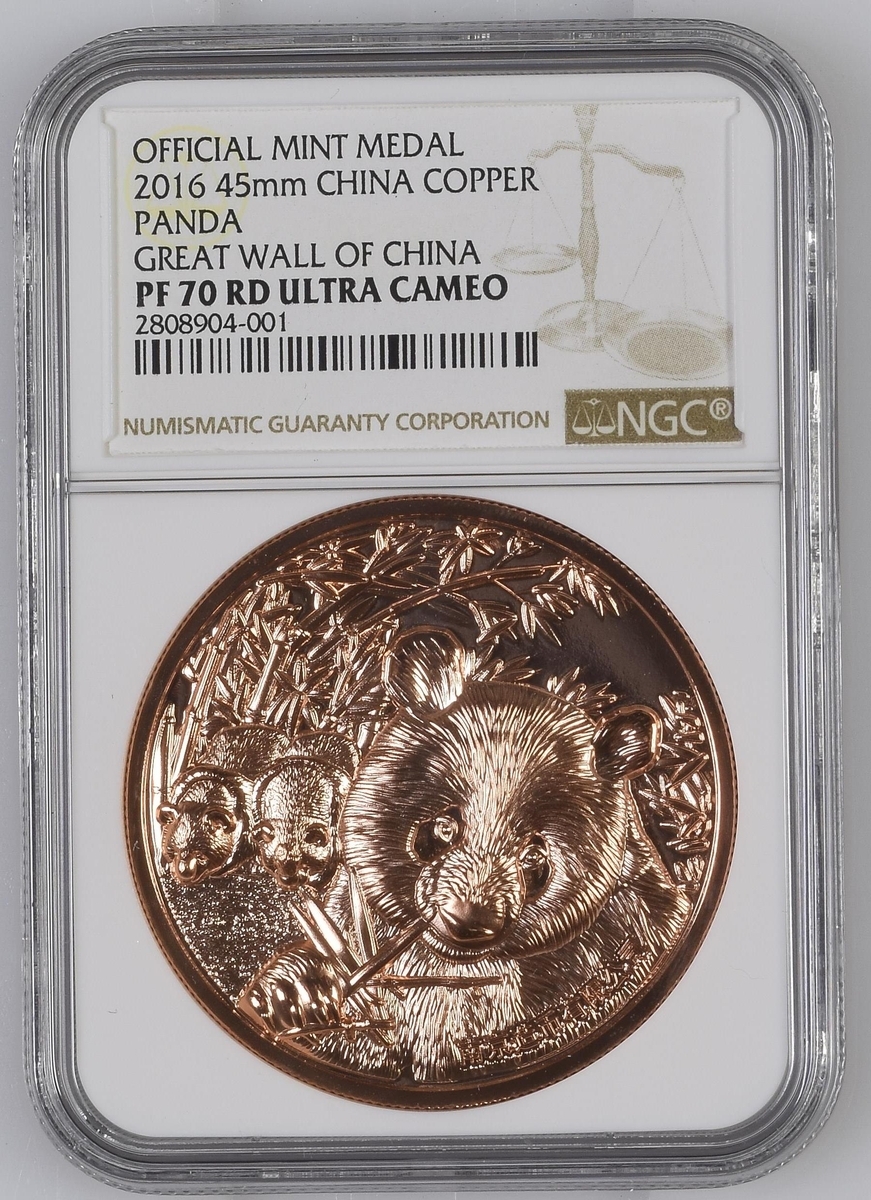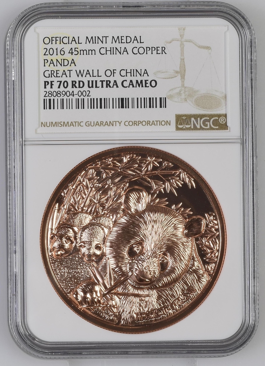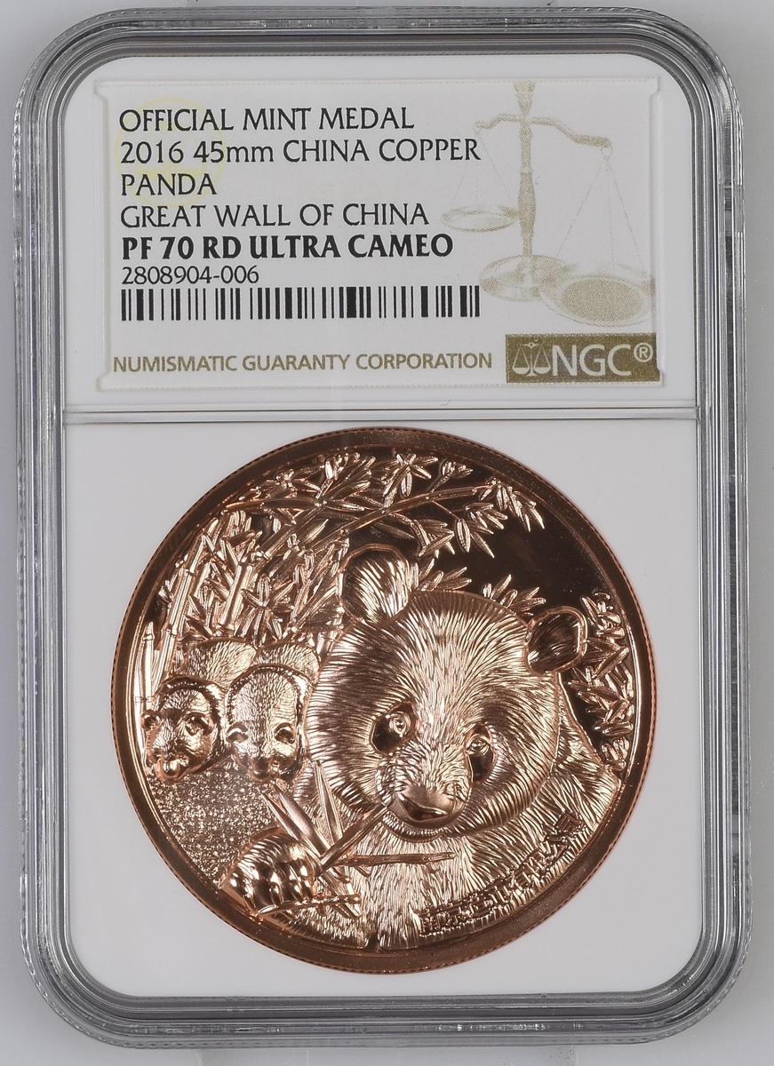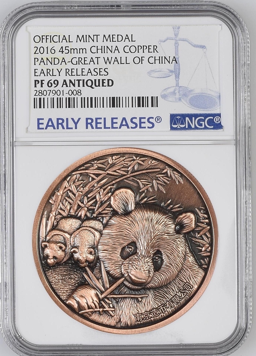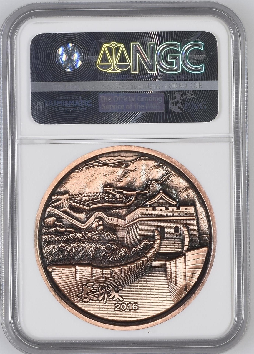 NGC PF69-PF70 | China, Republic, Official Panda Medal Series, 'Great Wall of China', 2016, engraved by Cheng Chao and Li Rui for Nanjing Mint Co. Ltd (6), Antiqued Matte Silver Proof, edge milled, 65.00g, 45mm., 12h, choice, as struck, ONLY 30 STRUCK in this finish, accompanied by Certificate of Authenticity (#027), in NGC holder, graded PF69 ANTIQUED (Cert. #2808904-011); another, | Early Releases | *Top Pop* | Brilliant Brass Proof, as before, edge milled, 65.00g, 45mm., 12h, brilliant, as struck, with a tiny mintage of 99 pieces, accompanied by Certificate of Authenticity (#027), in NGC holder, graded PF70 ULTRA CAMEO (Cert. #2808904-006) [*Joint Finest Certified*] [*Early Releases*]; others, Brilliant Copper Proofs (2), as before, edge milled, 65.00g, 45mm., 12h, brilliant, as struck, with a tiny mintage of 199 pieces, accompanied by Certificate of Authenticity (#027), in NGC holder, graded PF70 RD ULTRA CAMEO (Cert. #2808904-002) [*Joint Finest Certified*]; again, as before, edge milled, 65.00g, 45mm., 12h, brilliant, as struck, with a tiny mintage of 199 pieces, accompanied by Certificate of Authenticity (#093), in NGC holder, graded PF70 RD ULTRA CAMEO (Cert. #2808904-001) [*Joint Finest Certified*]; another, Antiqued Matte Copper Proof, as before, edge milled, 65.00g, 45mm., 12h, choice, as struck, ONLY 30 STRUCK in this finish, accompanied by Certificate of Authenticity (#027), in NGC holder, graded PF69 ANTIQUED (Cert. #2807901-008) [*Early Releases*]; lastly, Antiqued Matte Brass Proof, edge milled, 65.00g, 45mm., 12h, choice, as struck, ONLY 30 STRUCK in this finish, accompanied by Certificate of Authenticity (#027), in NGC holder, graded PF70 ANTIQUED (Cert. #2807901-007) [*Joint Finest Certified*] [*Early Releases*], with several Cases of Issue (6)