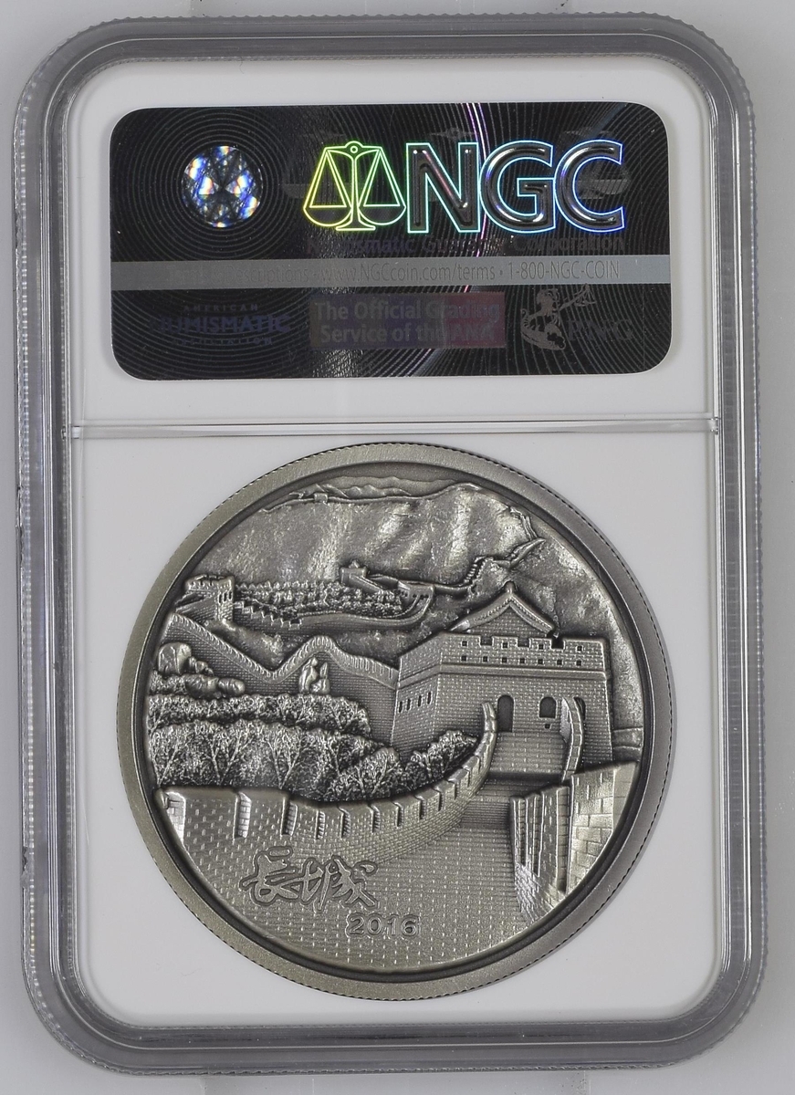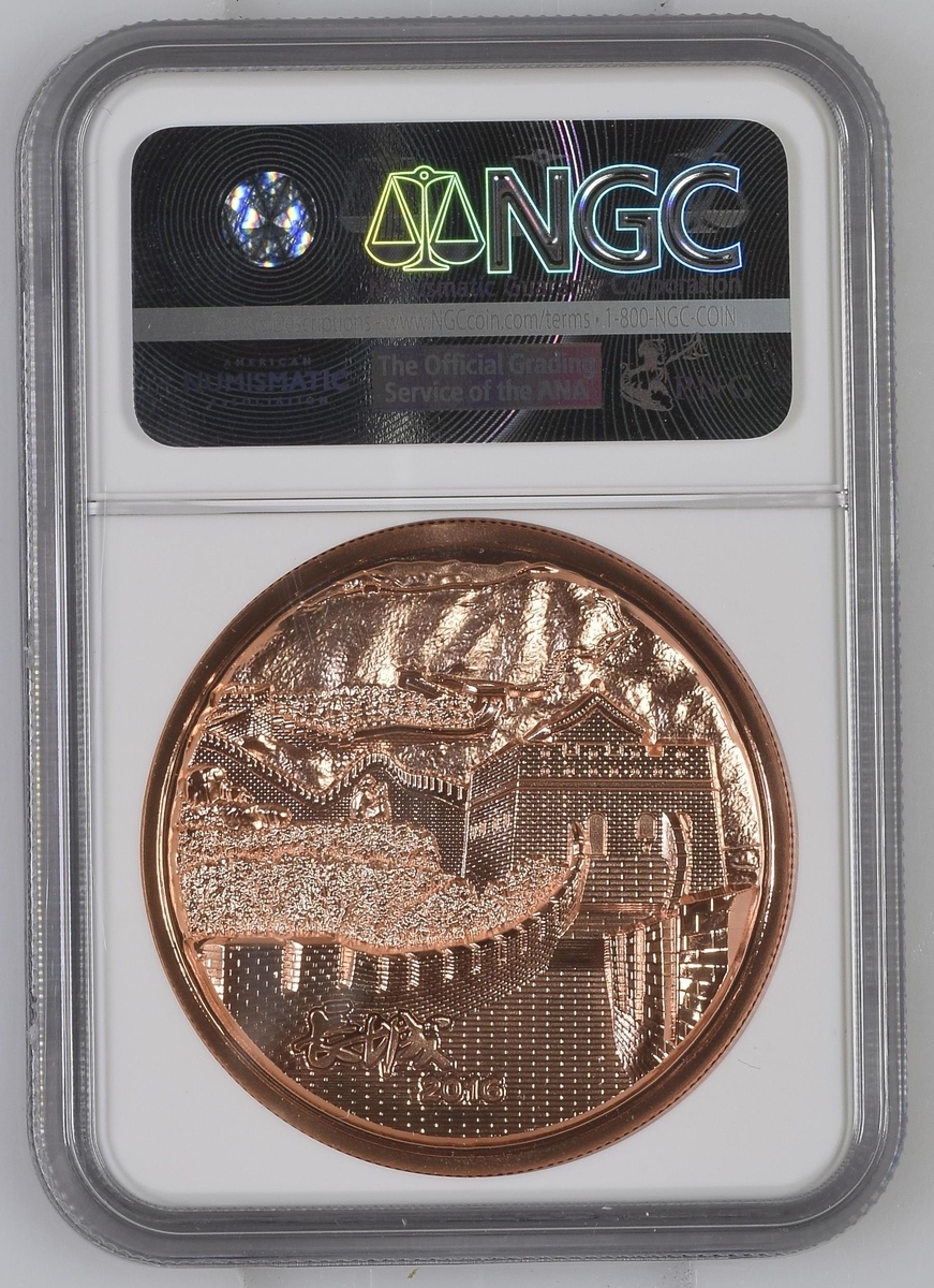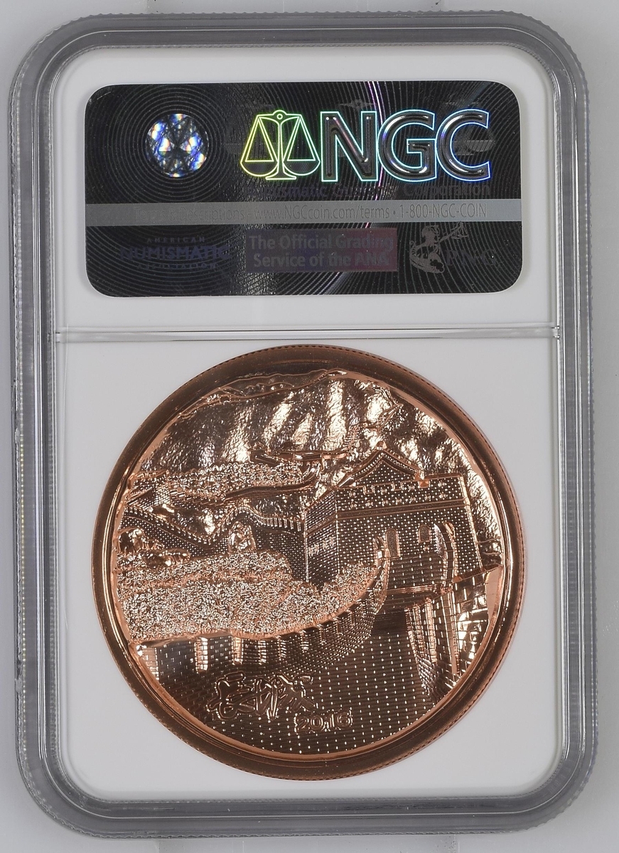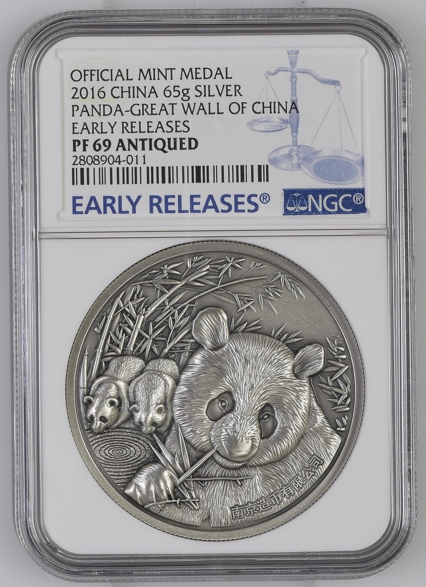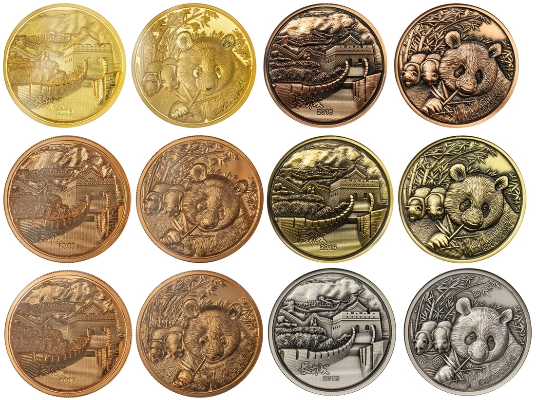 NGC PF69-PF70 | China, Republic, Official Panda Medal Series, 'Great Wall of China', 2016, engraved by Cheng Chao and Li Rui for Nanjing Mint Co. Ltd (6), Antiqued Matte Silver Proof, edge milled, 65.00g, 45mm., 12h, choice, as struck, ONLY 30 STRUCK in this finish, accompanied by Certificate of Authenticity (#027), in NGC holder, graded PF69 ANTIQUED (Cert. #2808904-011); another, | Early Releases | *Top Pop* | Brilliant Brass Proof, as before, edge milled, 65.00g, 45mm., 12h, brilliant, as struck, with a tiny mintage of 99 pieces, accompanied by Certificate of Authenticity (#027), in NGC holder, graded PF70 ULTRA CAMEO (Cert. #2808904-006) [*Joint Finest Certified*] [*Early Releases*]; others, Brilliant Copper Proofs (2), as before, edge milled, 65.00g, 45mm., 12h, brilliant, as struck, with a tiny mintage of 199 pieces, accompanied by Certificate of Authenticity (#027), in NGC holder, graded PF70 RD ULTRA CAMEO (Cert. #2808904-002) [*Joint Finest Certified*]; again, as before, edge milled, 65.00g, 45mm., 12h, brilliant, as struck, with a tiny mintage of 199 pieces, accompanied by Certificate of Authenticity (#093), in NGC holder, graded PF70 RD ULTRA CAMEO (Cert. #2808904-001) [*Joint Finest Certified*]; another, Antiqued Matte Copper Proof, as before, edge milled, 65.00g, 45mm., 12h, choice, as struck, ONLY 30 STRUCK in this finish, accompanied by Certificate of Authenticity (#027), in NGC holder, graded PF69 ANTIQUED (Cert. #2807901-008) [*Early Releases*]; lastly, Antiqued Matte Brass Proof, edge milled, 65.00g, 45mm., 12h, choice, as struck, ONLY 30 STRUCK in this finish, accompanied by Certificate of Authenticity (#027), in NGC holder, graded PF70 ANTIQUED (Cert. #2807901-007) [*Joint Finest Certified*] [*Early Releases*], with several Cases of Issue (6)