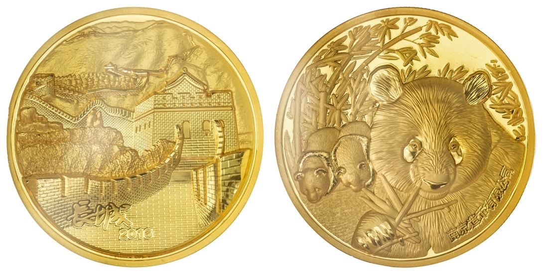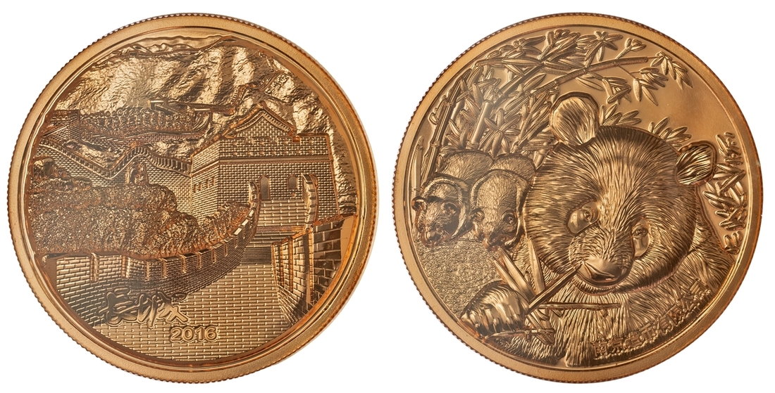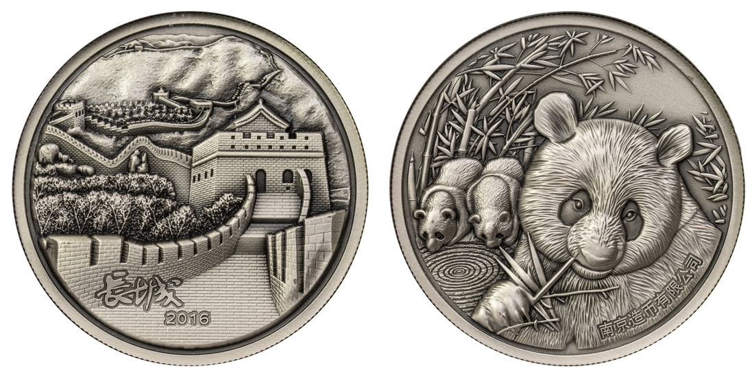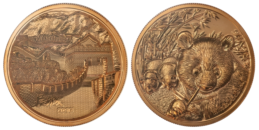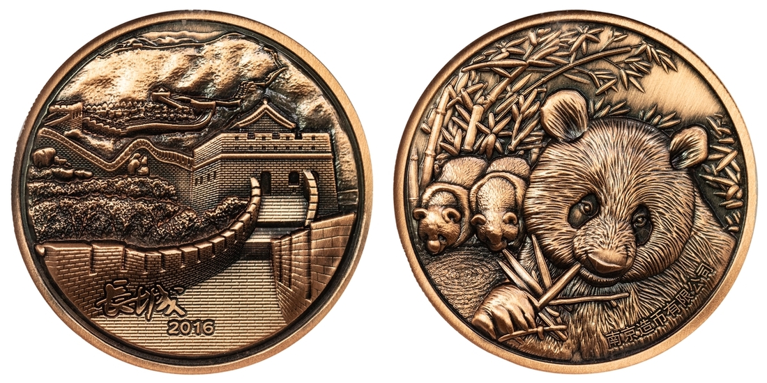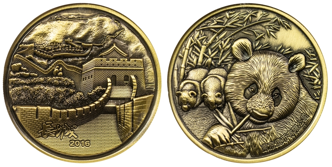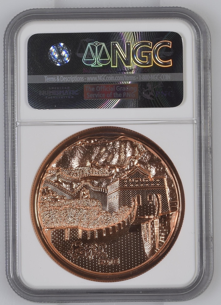 NGC PF69-PF70 | China, Republic, Official Panda Medal Series, 'Great Wall of China', 2016, engraved by Cheng Chao and Li Rui for Nanjing Mint Co. Ltd (6), Antiqued Matte Silver Proof, edge milled, 65.00g, 45mm., 12h, choice, as struck, ONLY 30 STRUCK in this finish, accompanied by Certificate of Authenticity (#027), in NGC holder, graded PF69 ANTIQUED (Cert. #2808904-011); another, | Early Releases | *Top Pop* | Brilliant Brass Proof, as before, edge milled, 65.00g, 45mm., 12h, brilliant, as struck, with a tiny mintage of 99 pieces, accompanied by Certificate of Authenticity (#027), in NGC holder, graded PF70 ULTRA CAMEO (Cert. #2808904-006) [*Joint Finest Certified*] [*Early Releases*]; others, Brilliant Copper Proofs (2), as before, edge milled, 65.00g, 45mm., 12h, brilliant, as struck, with a tiny mintage of 199 pieces, accompanied by Certificate of Authenticity (#027), in NGC holder, graded PF70 RD ULTRA CAMEO (Cert. #2808904-002) [*Joint Finest Certified*]; again, as before, edge milled, 65.00g, 45mm., 12h, brilliant, as struck, with a tiny mintage of 199 pieces, accompanied by Certificate of Authenticity (#093), in NGC holder, graded PF70 RD ULTRA CAMEO (Cert. #2808904-001) [*Joint Finest Certified*]; another, Antiqued Matte Copper Proof, as before, edge milled, 65.00g, 45mm., 12h, choice, as struck, ONLY 30 STRUCK in this finish, accompanied by Certificate of Authenticity (#027), in NGC holder, graded PF69 ANTIQUED (Cert. #2807901-008) [*Early Releases*]; lastly, Antiqued Matte Brass Proof, edge milled, 65.00g, 45mm., 12h, choice, as struck, ONLY 30 STRUCK in this finish, accompanied by Certificate of Authenticity (#027), in NGC holder, graded PF70 ANTIQUED (Cert. #2807901-007) [*Joint Finest Certified*] [*Early Releases*], with several Cases of Issue (6)