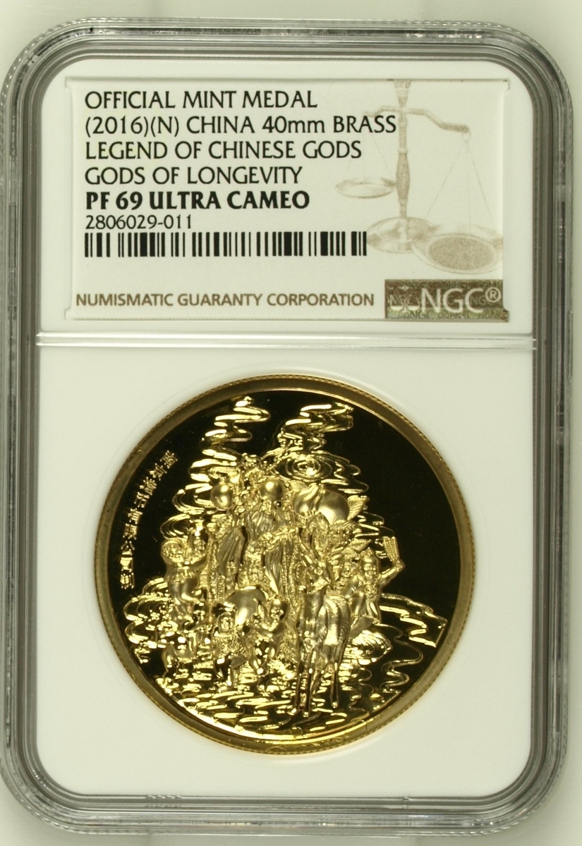 NGC PF69 ULTRA CAMEO | China, Republic, Official Brass Medal, 'Legends of Chinese Gods ~ Gods of Longevity, 2016, brilliant, as struck, in NGC holder, graded PF69 ULTRA CAMEO (Cert. #2806029-011)