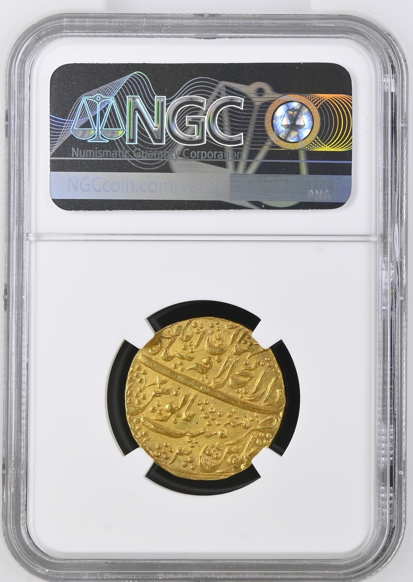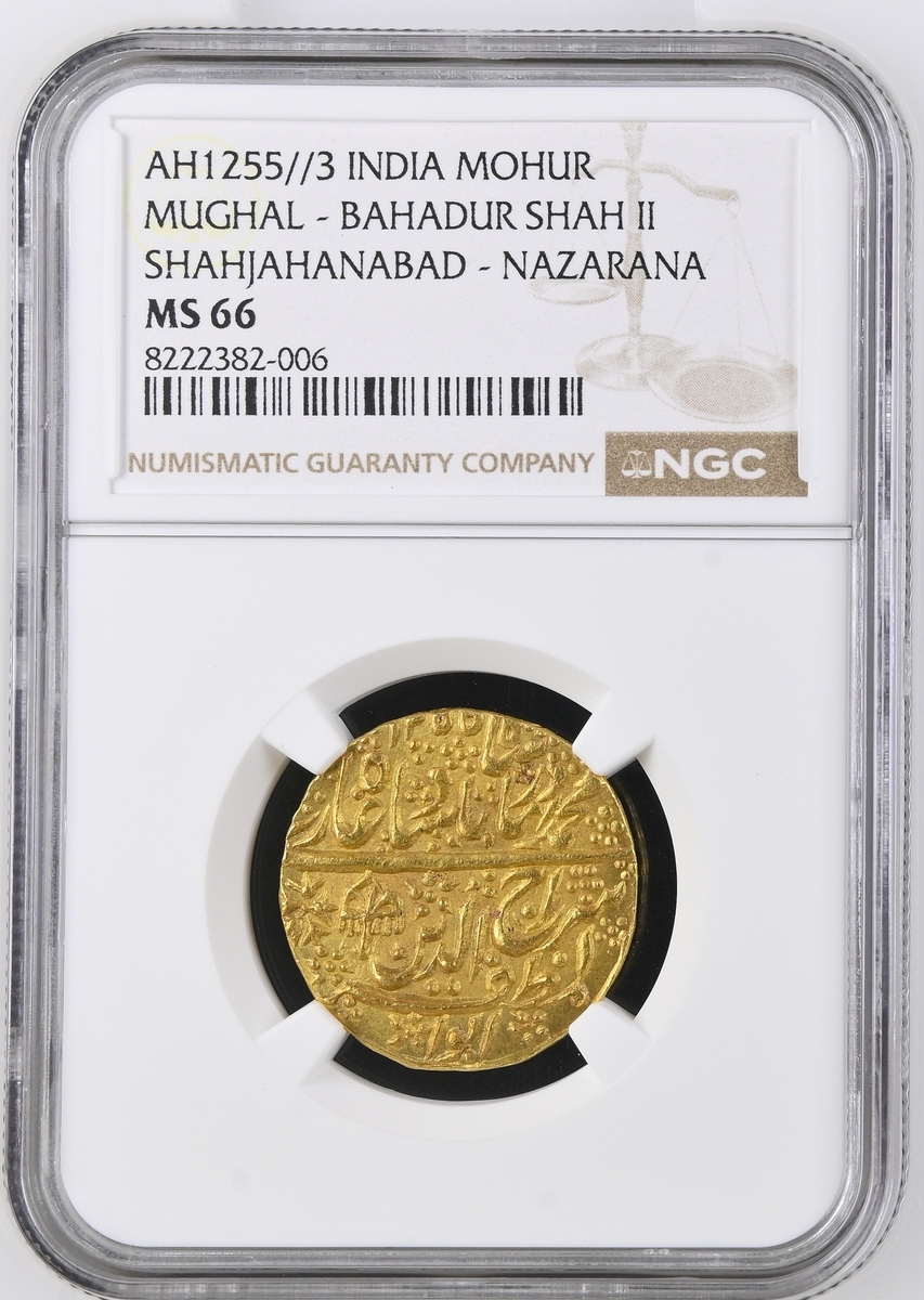 NGC MS66 | *Top Pop* | India, Mughal Empire, Bahadur Shah II (1837-1858), Nazarana Mohur, AH1255 / 3, Shahjahanabad, 10.74g (KM 790), with a pleasing lustre, extremely fine, in NGC holder, graded MS66 *Top Pop* [Single Finest Certified] (Cert. #8222382-006)