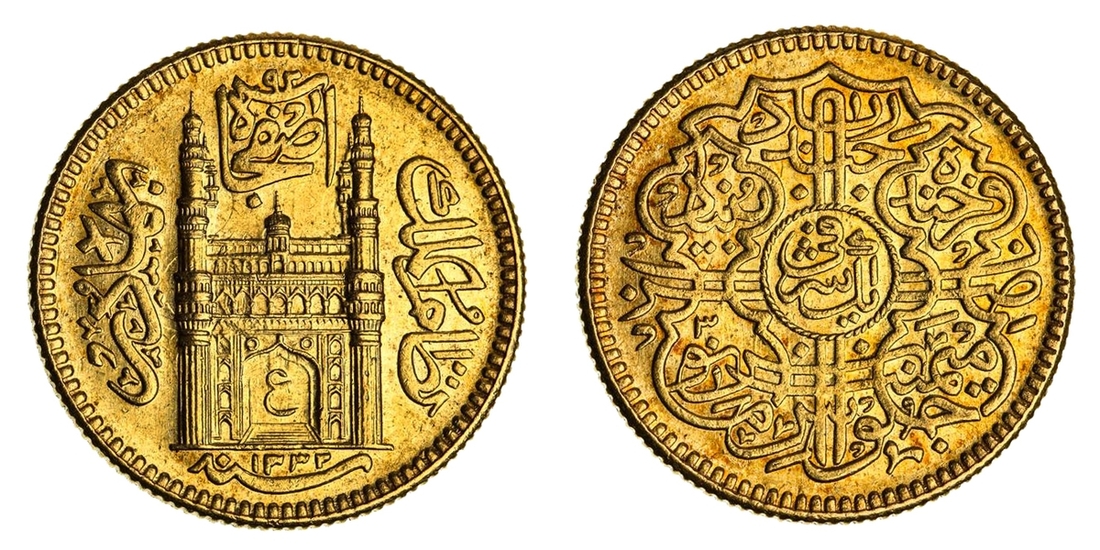 (g) Princely States, Hyderabad, Mir Usman 'Ali Khan (1911-1948), milled gold Ashrafi, AH1332 / 3, Haidarabad, Chahar Minar gateway with full 'Ain', edge milled, 11.15g, 12h (KM.57a), some minor surface friction and toning spots to reverse, otherwise with a glossy lustre, about extremely fine