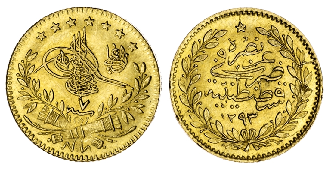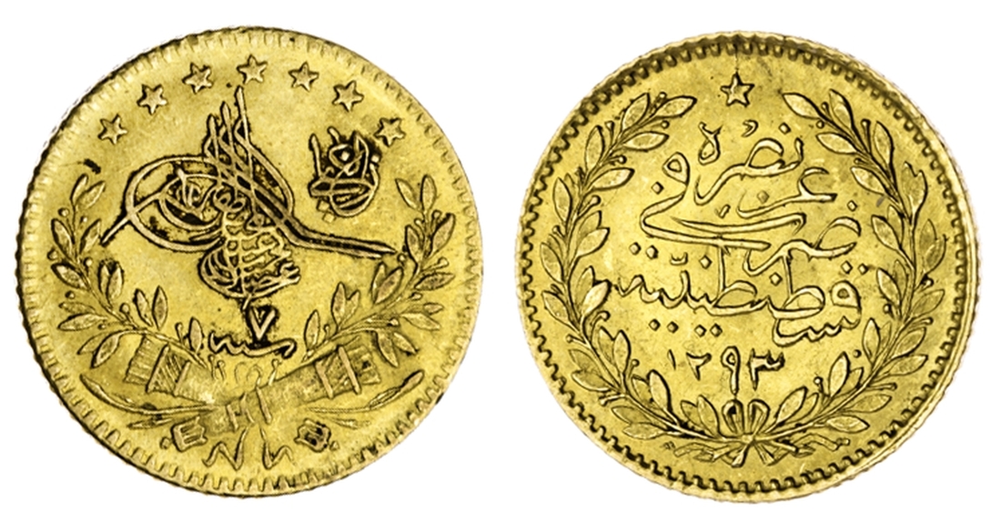 Ottoman Empire, Abdul Hamid II (1876-1909), gold 25-Kurush, AH1293 / 7, Toughra, 'el-Ghazi' to right, rev. value and date in wreath, 1.79g, 12h (Fb. 145; KM 729), extremely fine; another, gold 25-Kurush, AH1293 / 7, as before, 1.71g, 12h (Fb.145; KM 729), about extremely fine (2)