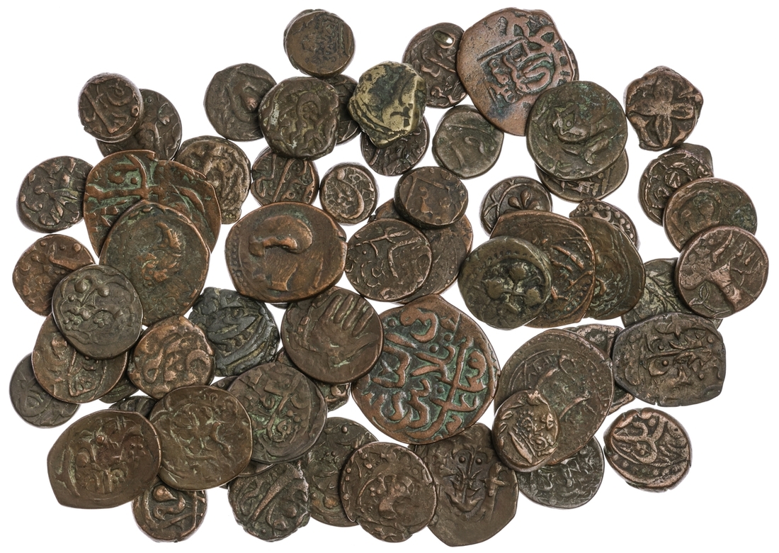 Afghanistan, anonymous (late 18th-19th century), AE coins (64), mostly pictorial issues, many different types including Qandahar under occupation, crown, rev. legend (3); peacock, hand, star with adl legend, sun face, bud, scimitars of various forms, four-petalled flower, and others, collected in Afghanistan in the late 19th century, a really good selection of types, some rarely seen, generally fine to very fine (64)