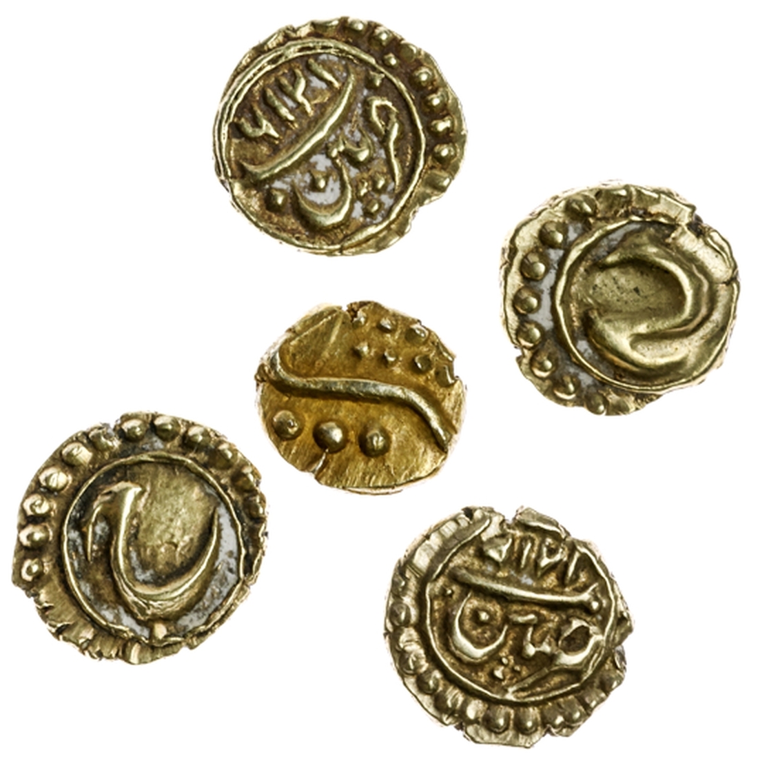 South India, Mysore State, Tipu Sultan (1782-1799), gold Fanams, Patan (4) AH1198; AH1216, date retrograde; AM1219, date retrograde (2) (KM 128.1); and, Viraraya Fanam, previously cleaned and with deposits in fields, generally extremely fine, some better (5)