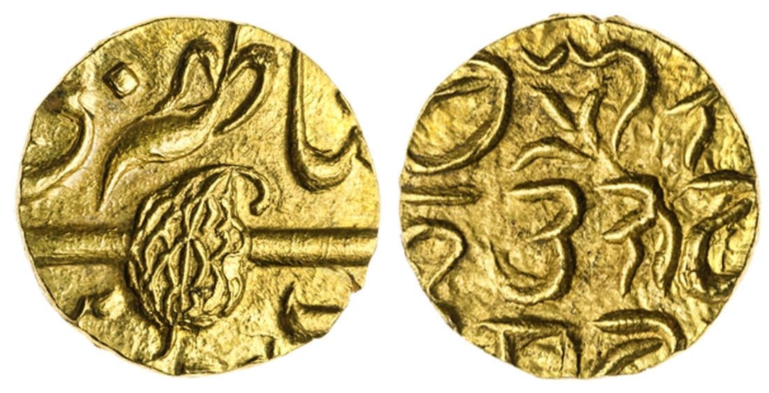 (g) Princely States, Kashmir, Dogra Rajas, Ranbir Singh (1857-1885), gold Nazarana or Nisar 'Ceremonial' coin, 1.40g, Srinagar, date off flan, in style of third silver series reduced weight Rupees (Y.#16b), leaf mark divides Persian legend, Raghanatha Ji Saha'i zarb Srinagar, with J.H.S (Jesus Hominum Salvator) below (mostly off flan), rev. part of Takari legend Raghanatha Ji Saha Jarava Srinagara (date) (KM. Y#22 var. See also ONS Newsletter no. 125, July - August 1990, Stan Goron, p. 6, and no. 128, March - May 1991, "The Gold 1/4 Mohur of the Ranbir Singh of Kashmir: some further comments", N. G. Rhodes, p. 10), very rare, unrecorded at this weight, uncirculated