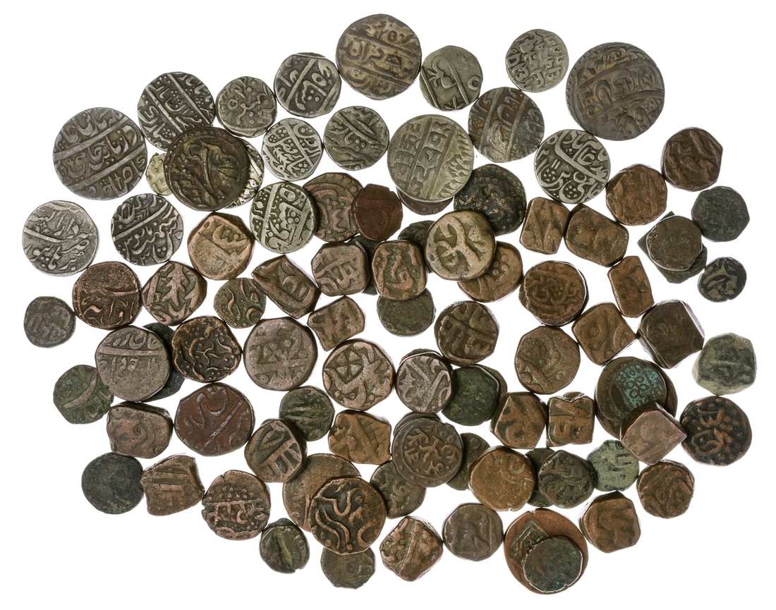 Princely States, Miscellaneous Coins, Rupees (17); Quarter-Rupee, including issues of Awadh (Najibabad), Dholapur, Farrukhabad, Gwalior, Mewar, Maratha States; and AE coins (78), mostly issues of northern states, but including a Paisa of Mysore, collected in Afghanistan in the late 19th century, the Rupees mostly toned very fine or better, many with original annotated collector envelopes, the AE coins mostly dump types, an interesting mix, average condition about fine (95 approx.)