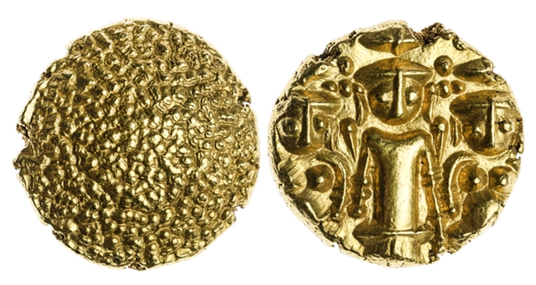 (g) South India, East India Company, Madras Presidency (c.1740-1807), gold Three-Swami (Kuruki) Pagoda, three half-length figures under a canopy, rev. granulated, 3.44g (Fr.1575; KM 304; Pridmore 3B), extremely fine