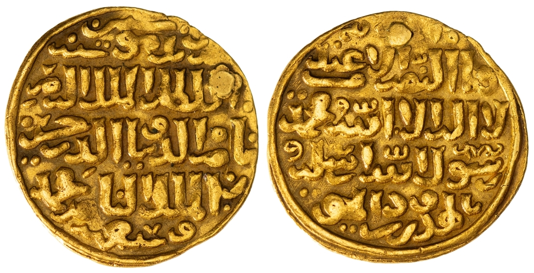 (x) Bahri Mamluk, Al-Nasir Hasan, Second Reign, (1354-1361), gold Dinar, AH760, Dimashq (Damascus), 5.61g (Album 944; Balog 358), pierced and plugged, very fine