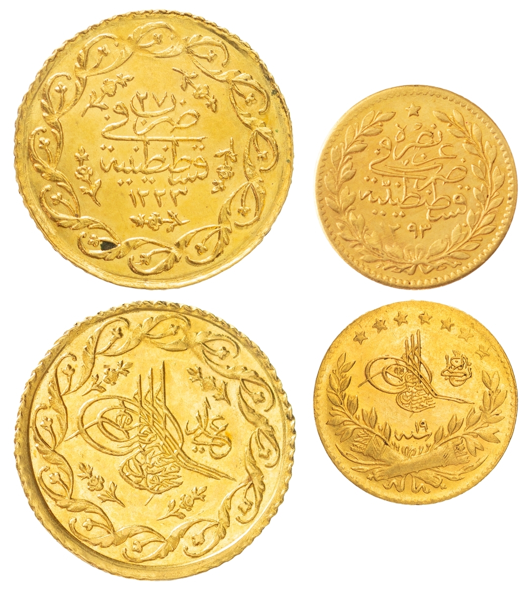 (g) Ottoman Empire, Mahmud II (1808-1838), Half-Cedid Mahmudiye, AH1223 / 27 (1834), Constantinople, edge obliquely milled, 1.57g, 12h (KM 644), lustrous, extremely fine; and, Ottoman Empire, Abdul Hamid II (1876-1909), 25-Kurus, AH1293 / 19 (1894), Constantinople, edge milled, 1.79g, 12h (KM 729), lustrous, good very fine (2)
