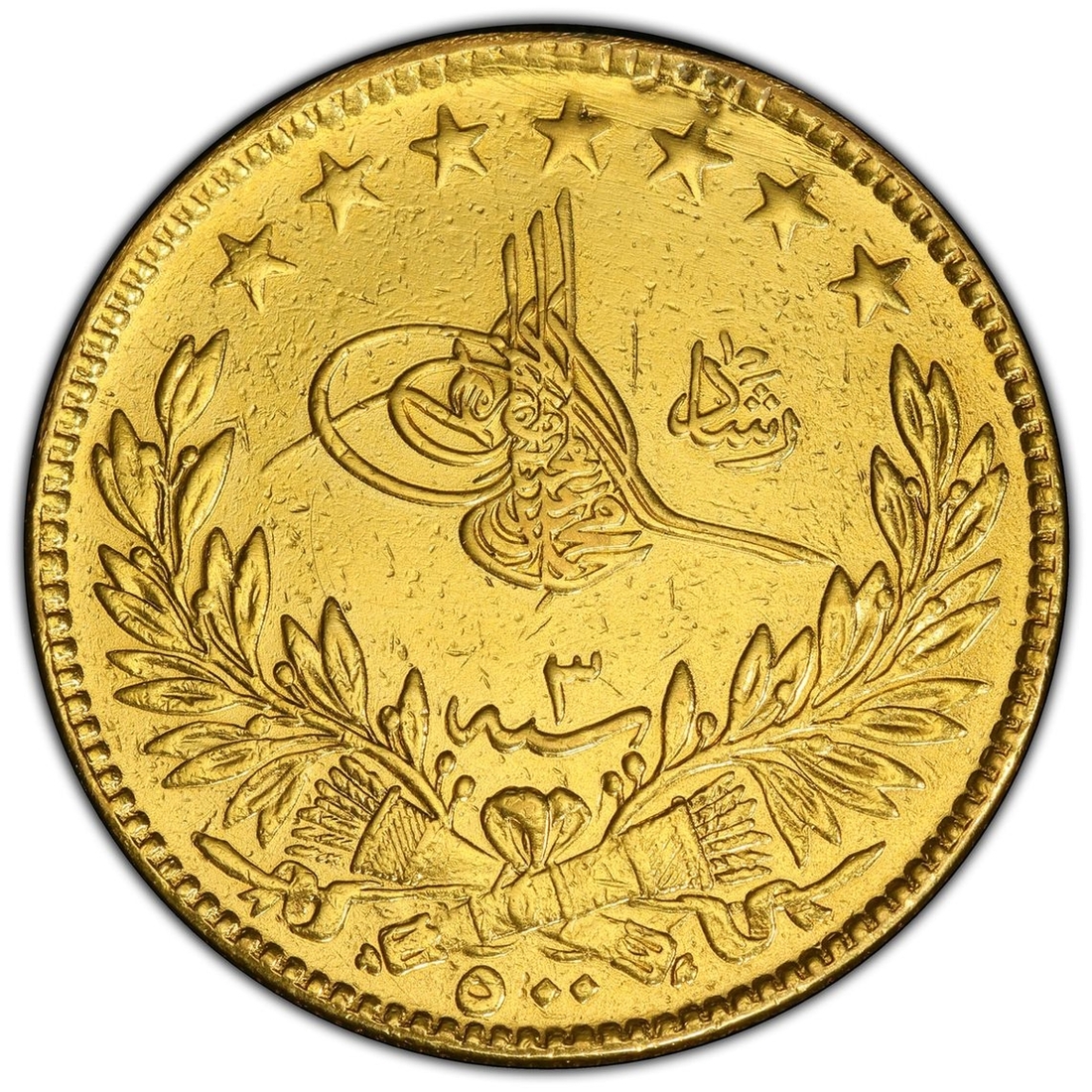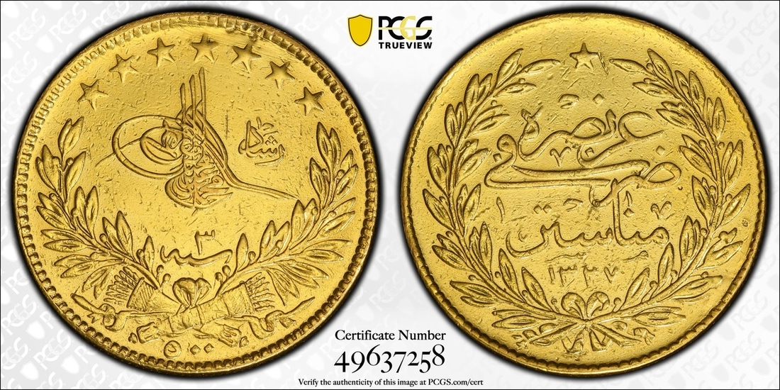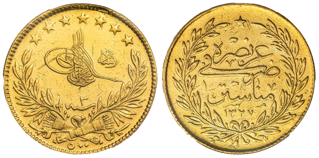 (g) PCGS AU DETAILS | Ottoman Empire, Turkey, Mehmed V (1909-1918), 500 Kurush, AH 1327 / 3 (1911), Manastir, edge milled, 12h (KM 807), heavily sweated and repaired at 12 o'clock, thus with evidence of previous mounting, very fine, one of only 20 struck and thus very rare, in PCGS holder, graded AU DETAILS ~ REPAIRED (Cert. #49637258)