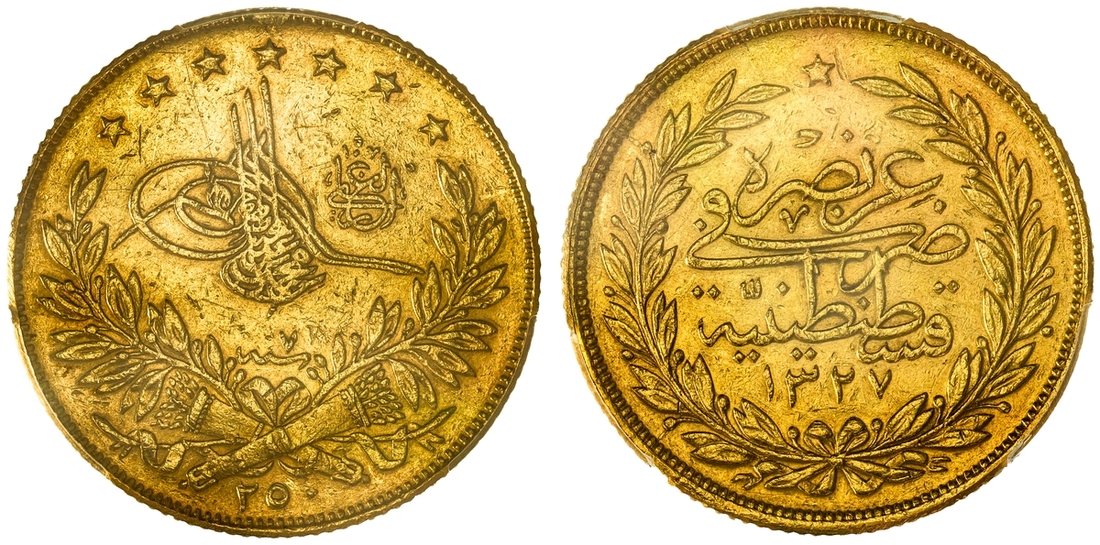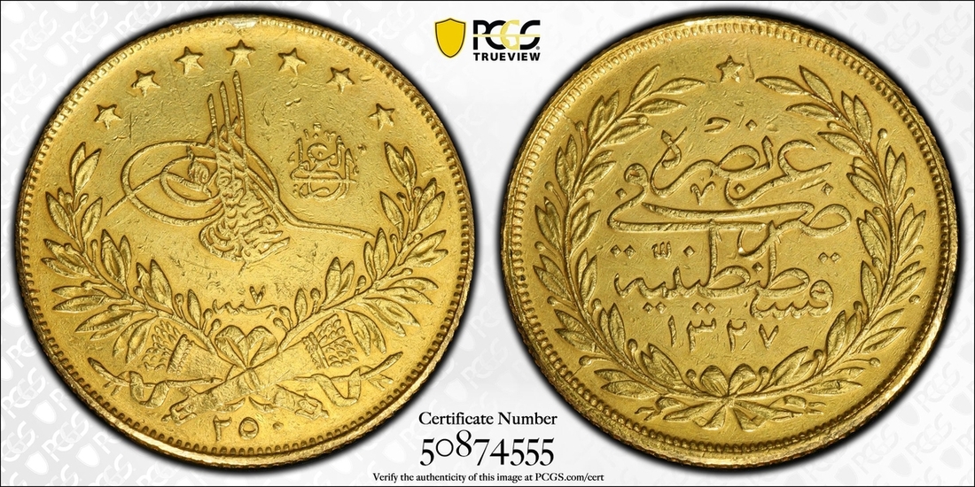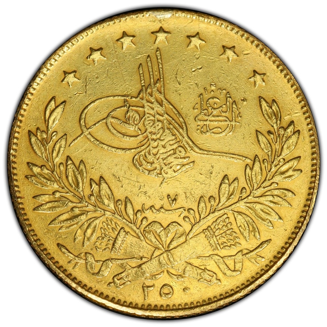 (g) PCGS AU DETAILS | Ottoman Empire, Turkey, Mehmed V (1909-1918), 250 Kurush, AH 1227 / 7 (1915), edge milled, 12h (KM 777), heavily sweated and previously mounted, nonetheless bolder very fine, one of only 30 struck and thus very rare, in PCGS holder, graded AU DETAILS ~ MOUNT REMOVED (Cert. #50874555)