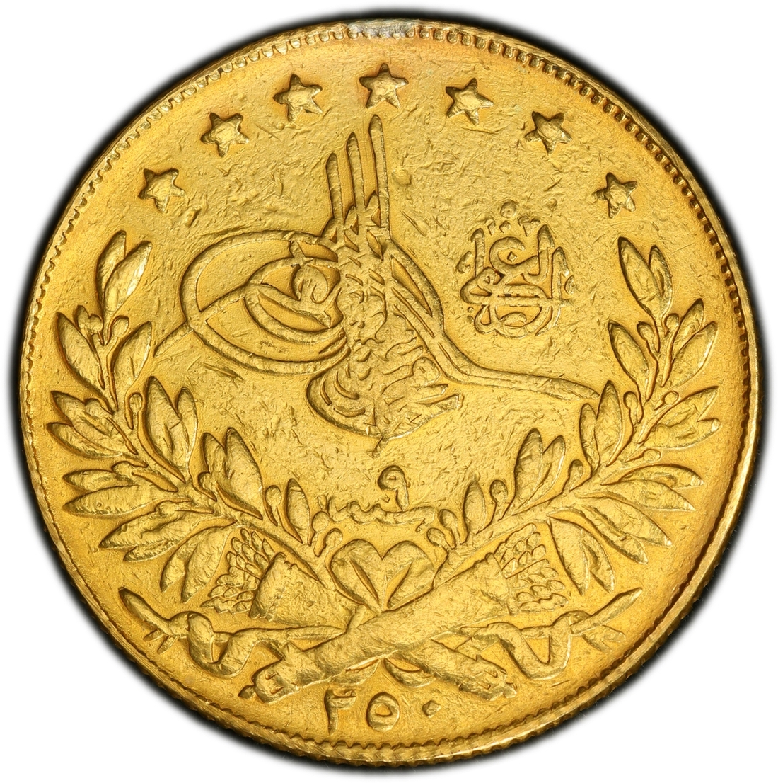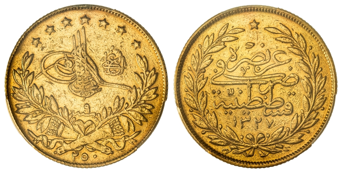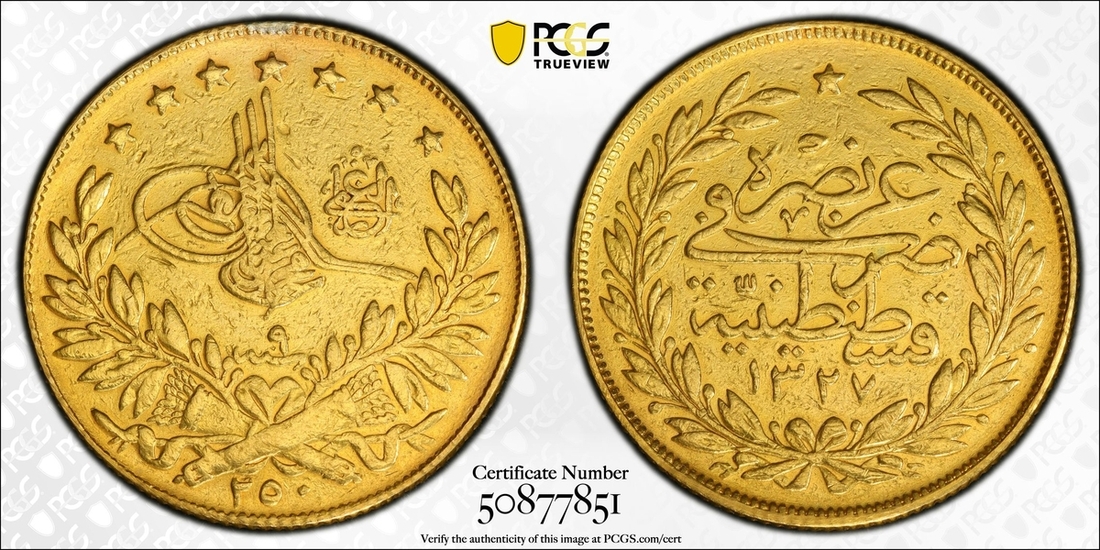 (g) PCGS XF DETAILS | Ottoman Empire, Turkey, Mehmed V (1909-1918), 250 Kurush, AH 1227 / 9 (1917), edge milled, 12h (KM 777), heavily sweated surfaces and previously mounted, very fine, one of only 28 struck and thus very rare, in PCGS holder, graded XF DETAILS ~ MOUNT REMOVED (Cert. #50877851)
