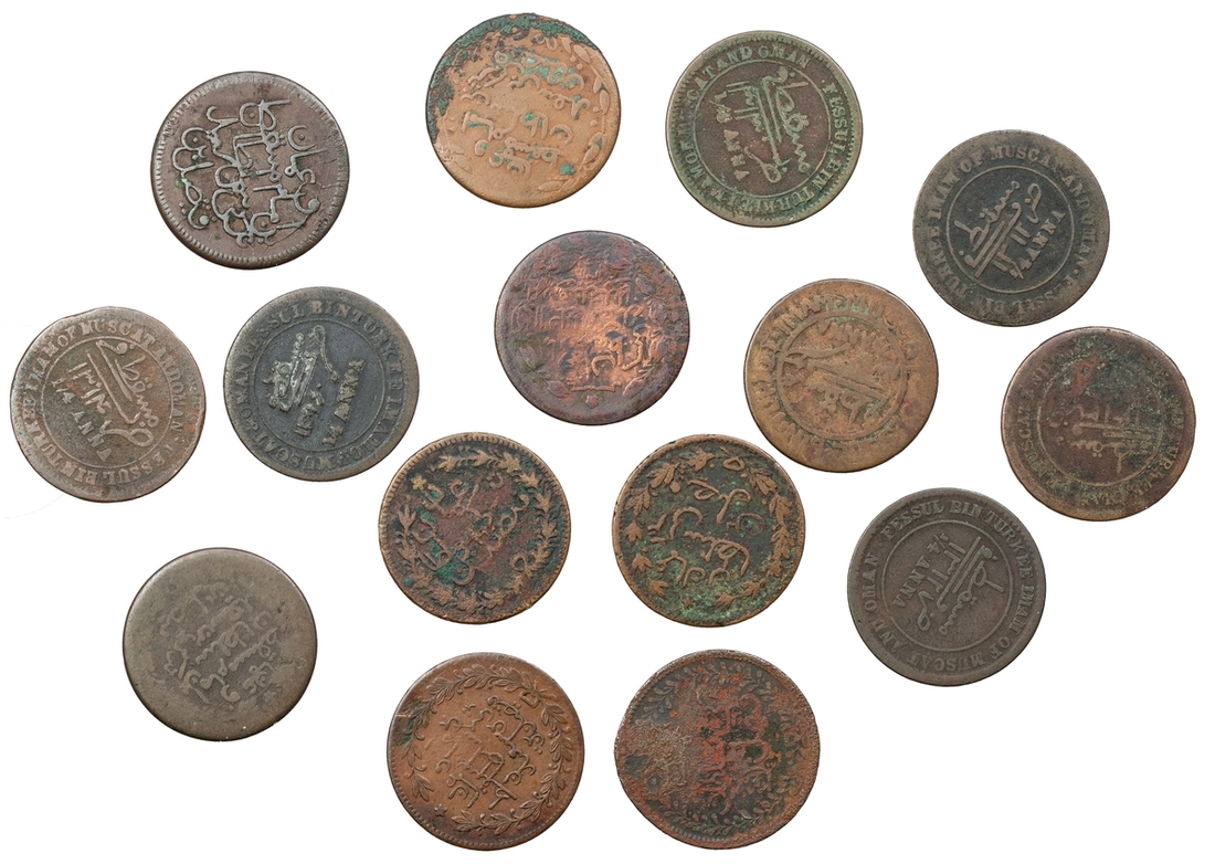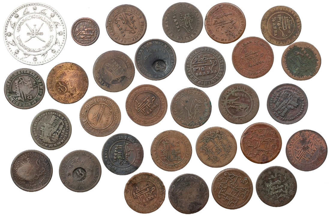 Muscat and Oman, a collection of early copper coinage, together with a collector’s booklet on the subject, including: Faisal bin Turkee (1888-1913), AE ¼-Anna (3), 1/12 Anna, AH1311 (1894), view of town and fort of Muscat, rev. Arabic legend within wreath (KM 1, 2), AE ¼-Anna (35), legend both sides, a good selection of dates and types (KM 3 – 14); Taimur bin Faisal (1913-32), AE 1/4-Anna, AH1315, with Arabic "ST" countermark (2); Sa'id bin Taimur (1932-70), AE ¼-Anna, AH1315 where visible, with Arabic "SS" countermarks (3), 1- Saidi Rial, AH1378 (KM C.19, 20, 21, 31), including many key variants and rarities, fine or better, above average for type (45)