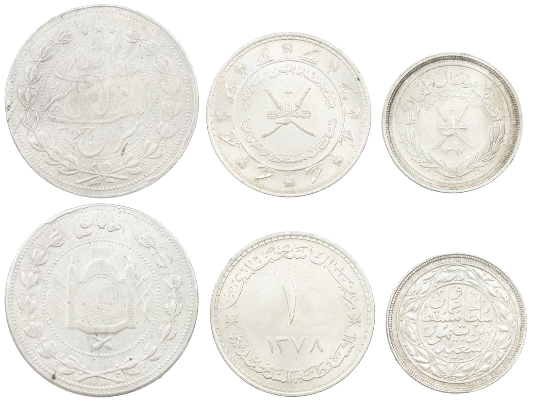 Muscat and Oman, Sa'id bin Tamur (1932-1970), Rial, AH 1378 (1959), edge milled, 27.99g, 12h (KM 31), with a cartwheel lustre, extremely fine; Oman, Dhofar Government, Sa'id bin Tamur (1932-1970), Half-Rial, AH1367 (1948), edge milled, 13.94, 12h (KM 29), toned and lustrous, extremely fine; Afghanistan, Habibullah Khan (1901-1919), 5-Rupees, AH1324 / 7 [1926], edge milled, 46.02g, 12h (KM 843), some excess metal to edge, softly struck, very fine (3)