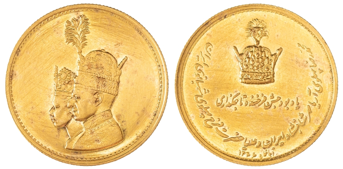 (g) Persia (Iran), Coronation of Muhammad Reza Pahlavi, Gold Medal, SH1346 (1967), conjoined, crowned and draped busts left, rev. crown, inscription below, edge milled, 24mm, 10.50g, heavy hairline scratches to the fields and some discolouring, otherwise with a residual brilliance, struck details extremely fine