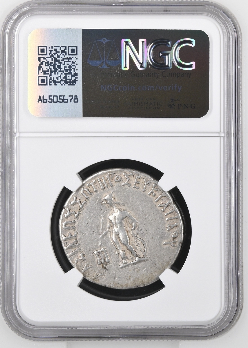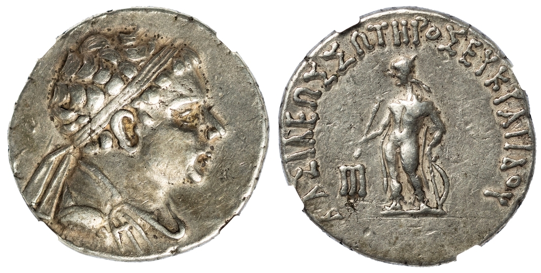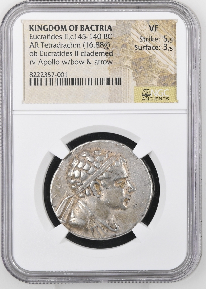 NGC VF | Kingdom Baktria, Eukratides II Soter (145-140 BC), AR Tetradrachm, diademed and draped bust right, rev. BASILEWS SOTHROS EUKRATIDIOY, Apollo standing left, holding bow and arrow, monogram to left, 16.04g (Bopearachchi 3B; Mitchener 173a; SNG ANS 625), reverse worn yet toned and rare, very fine, in NGC 'Ancients' holder, graded VF [Strike 5/5, Surface 5/5] (Cert. #8222357-001)