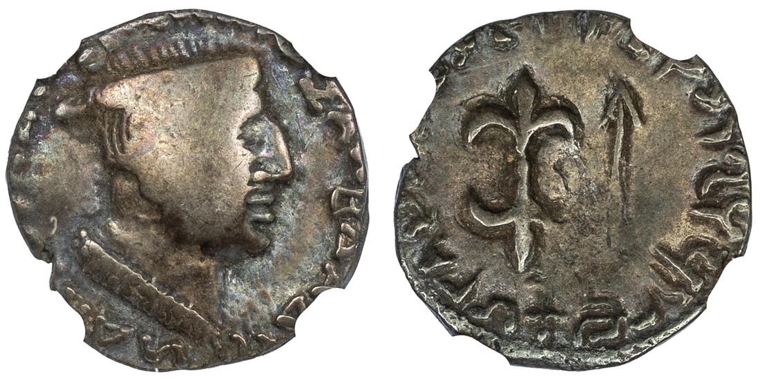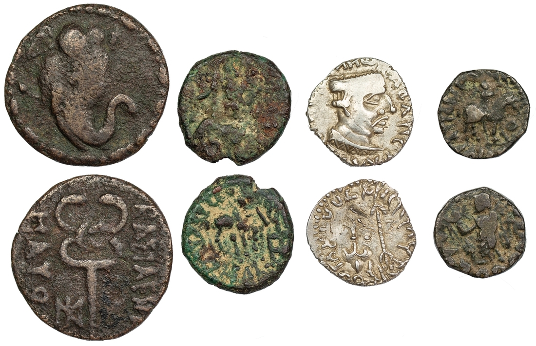 Indo-Scythian and Indian, a Selection of Bronze and Silver Issues (5): i) Maues, AE Denomination C, struck c. 85-80 BC, elephant head right, wearing bell around neck, bead and reel border, rev. caduceus, monogram to left, 8.11g (Senior 5.1), good fine; ii) Azes, AR Drachm, uncertain type, horseman right, rev. goddess (?) standing left, 2.14g, fine; Nahapana (2): iii) AR Drachm, struck c. 53-99 BC, PANNIW SAHAPATAC NAHAPANAC, head of Nahapana right, rev. KsaHaRaTaSa NaPaNaSa (in Brahmi to left) and RaNo KsaHaRaTaSa NaHaPaNaSa (in Kharoshthi to right), thunderbolt and arrow, 2.56g (Fisherman Type 3.1), short flan and traces of overstriking, very fine; iv) another, 2.56g (Fisherman Type 3.1), NGC graded fine (2); v) uncertain Satrapal AE Coin, 3.05g, corroded, about fine; (5)
