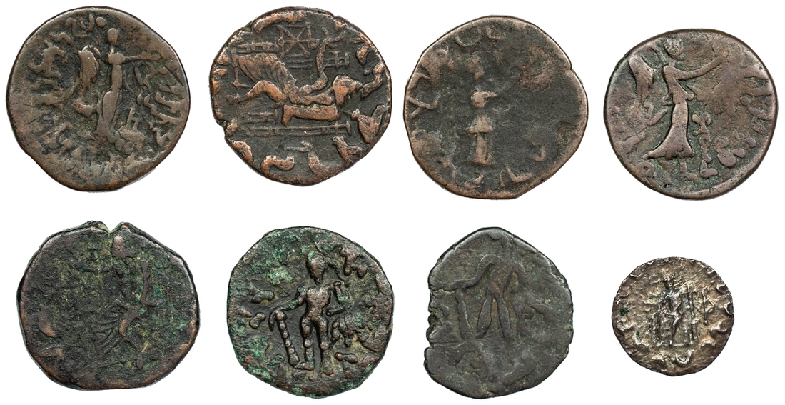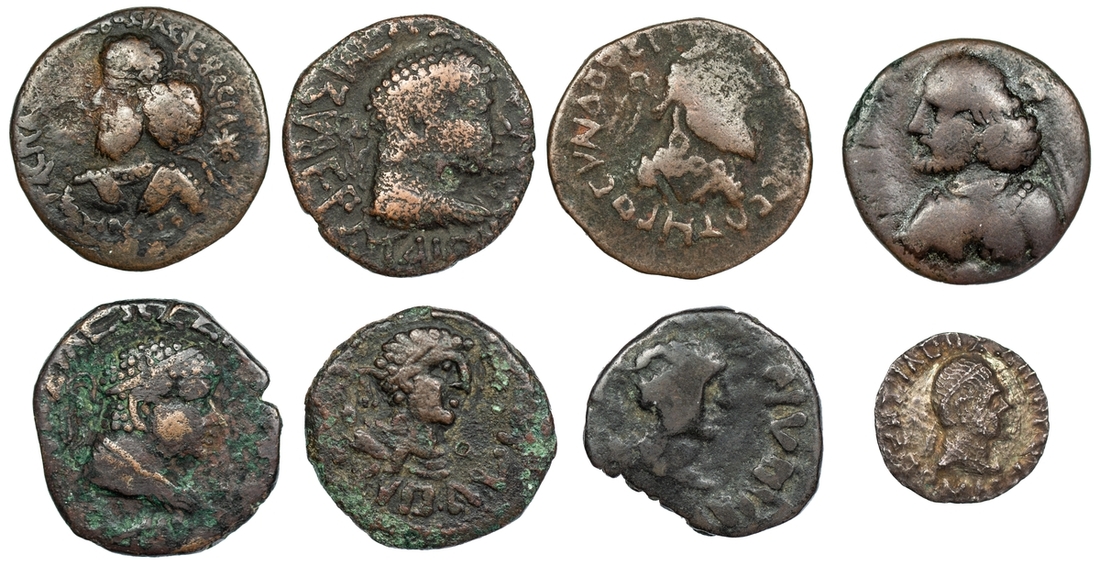 Indo-Scythian, Indo-Parthian, and Kushan, a Selection of Silver and Bronze Issues (8): Hermaios (3): i) AR Drachm, posthumous issue struck by Indo-Scythians (c. 50-35 BC), 1.47g (HGC 12, 302); ii) also, AE Tetradrachm, posthumous issue struck by Indo-Scythians (c. 70-65 BC), 9.20g (HGC 12, 308); iii) another, 8.72g (HGC 12, 308) (3); iv) Pakores, AE Tetradrachm (mid-late 1st century AD), 8.07g (Senior 269); v) Orthagnes, AE Tetradrachm (early 1st century AD), 7.90g (Senior 246); vi) Gondophares, AE Tetradrachm (c. 40-5 BC), 8.55g (Senior 213); Kujula Kadphises (2): vii) AE Tetradrachm, struck in the name of Hermaios (mid-late 1st century AD), 4.80g (HGC 12, 309); viii) another, 5.78g (HGC 12, 309) (2); all about fine to good fine, (8)