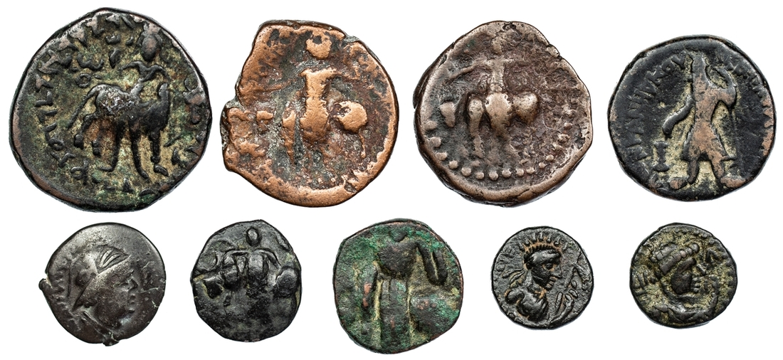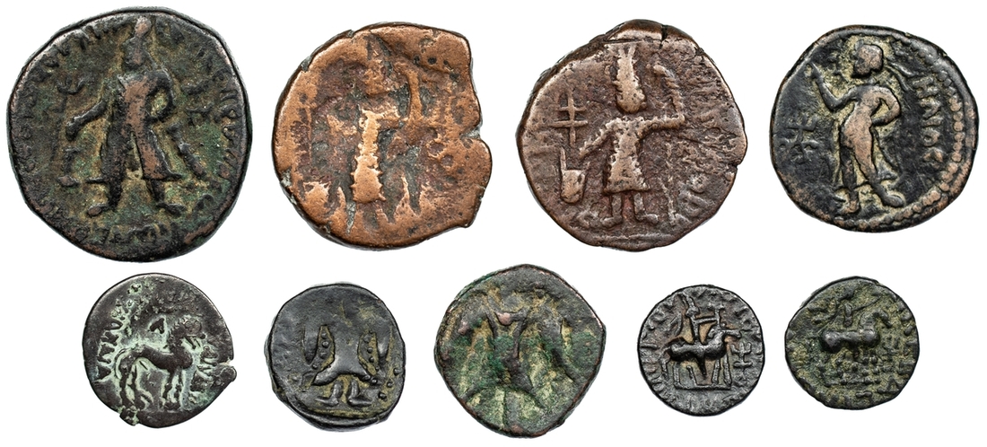 Bactrian and Kushan, a Selection of Bronze and Silver Issues (9): i) Yue-chi, Sapadbizes, AR Hemidrachm, struck late 1st century BC, helmeted and draped bust right, rev. lion standing right, lambda and crescent above, 1.50g (HGC 12, 516), fine; ii) Kushan, Kanishka I, AE Didrachm, struck c. 128-52 AD, Kanishka standing left, holding goad and standard, sacrificing over altar, rev. radiate Helios, standing left, raising right hand, tamgha to left, 8.12g (SNG ANS Kushan 391-402), fine; iii) Vima Kadphises, AE Tetradrachm, struck c. 113-127 AD, king standing left, wearing diadem, bonnet and skirted tunic, dropping pellets over altar with right hand, holding hilt with left, trident-axe to left, tamgha to right, rev. Shiva standing facing, behind, bull right, 15.57g (AND Kushan 274-302), fine; B>Vima Takto (2): iv) AE Drachm, struck c. 80-100 AD, radiate bust of Vima Takto right, tamgha to left, rev. Vima Takto on horseback right, tamgha to right, 2.17g (MAC 2990), good fine; v) another, 2.01g (MAC 2990), fine (2); vi) Vasudeva (2), AE Issue, struck c. 190-230 AD, uncertain type, 8.03g (ANS Kushan 1123-51), fair; vii) another, 8.01g (ANS Kushan 1123-51), about fine (2); Vasudeva Imitation (2): viii) AE 3b, abstract king standing over altar left, rev. abstract Siva standing facing, 2.64g (ANS Kushan 1933-78), fine; ix) similarly, uncertain AE issue, 3.83g, about fine (2); (9)