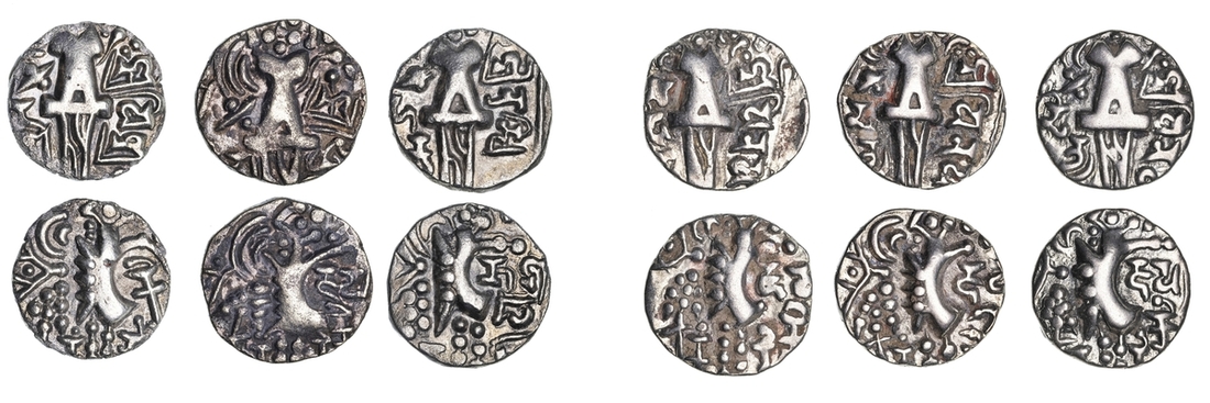 India, Post-Kushan, Kidarite (c.5th century), base gold Dinars (6), Sri Vigraha Deva, 6.45g, Durla Deva, 7.25g, Namvihakya, 6.37g, Vinayaditya (3), 7.48g, 7.46g, 7.71g, all with similar designs: abstract figure of king standing left, rev. crude figure of 'Ardoksho' facing, with Brahmi legends around (MAC 3650, 3651, 3653-5, 3656), generally good very fine to extremely fine with clear legends, above average for type (6)