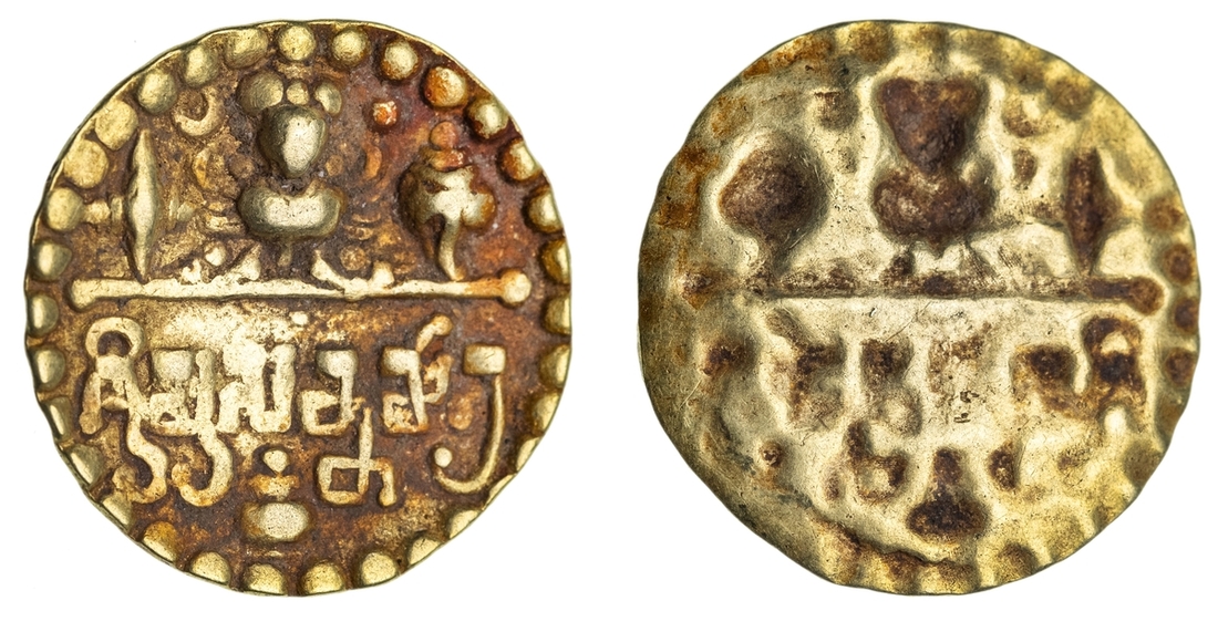 India, Post-Gupta, Kosala, Sarabhapuriyas, Prasannamatra (c. 525-50), gold Bracteate Unit, 1.28g, Garuda bird facing, flanked by discus and conch above Brahmi legend sri prasannamatra and kumbh (jar) below (Mitchiner ATEC 5207; MNI -), toned about very fine