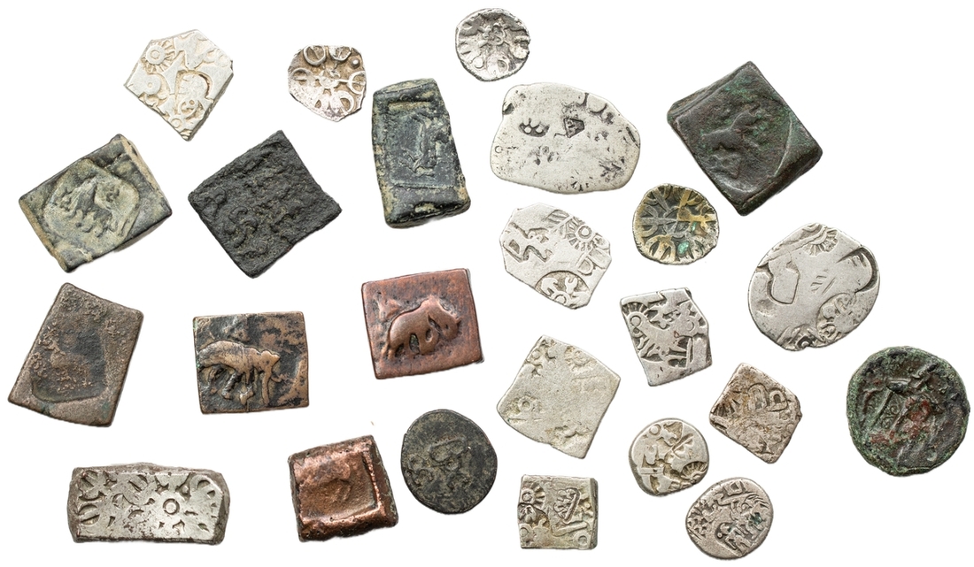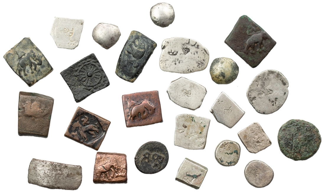 Ancient India, Taxila & Gandhara (c.5th-4th century BC), Bent Bar, short wide type, two radiate symbols either end, 1/8-Satamana, single symbol (3) (MACW 4070, 4079), fine to very fine; Pushkalavati (c.185-160 BC), rectangular AE Units (7), elephant right / lion left (5), elephant right/ horse left (2), fine or better; Taxila (c.220-180 BC), AE Quarter-Unit, three-arched hill and taurine symbol either side, ‘Five Guilds’ square AE Unit, spoked wheel / Swastika between two Nandipadas, legend below (MACW 4401, 4404, 4415, 4423), fine to very fine, the ‘Five Guilds’ rare; Mauryan and Sunga Empires (321- 75 BC), AR punchmarked Karshapanas (10), all different, poor to good fine, together with a Greek AE Unit, very good (24)