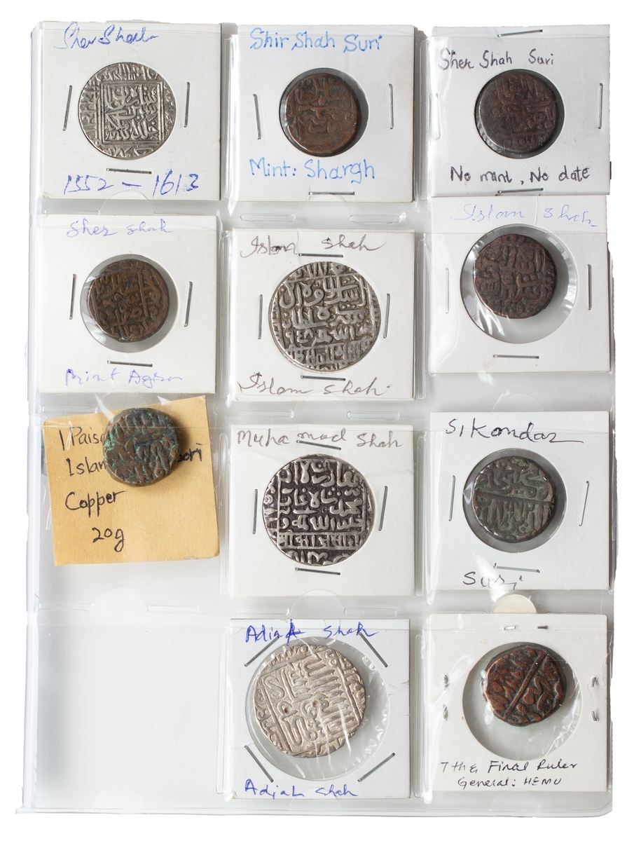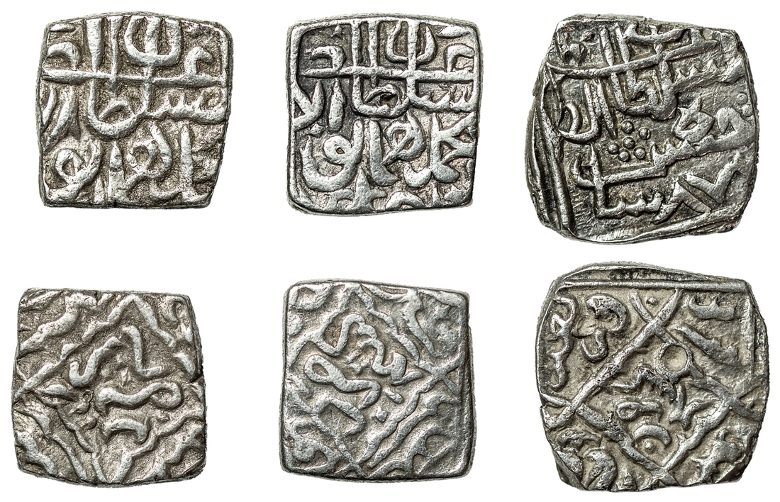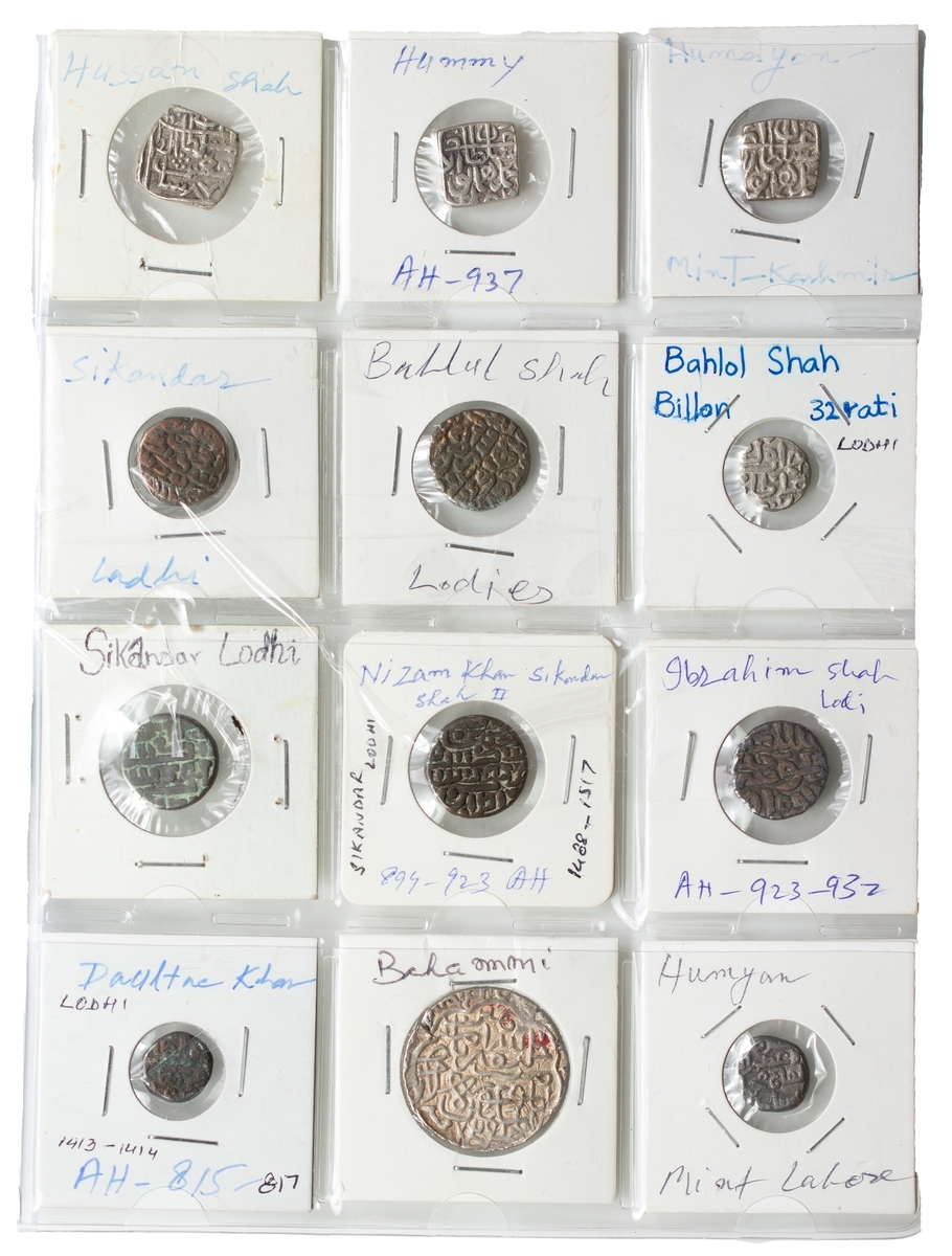 India, Sultanates, Kashmir, Humayun (1546-1550), square Sasnu (2), one with ‘Kashmir’ written retrograde, dates unclear (G & G. K 104/5), both very fine and rare, Hasan Shah (1472-84), square Sasnu, AH876 (G & G. K 31), with a shroff mark, very fine; together with other Sultanate coins of the Lodis (7), Suris (11), Bahmanids (1), and a Jital of Lahore, copper coins fine or a little better, the silver generally very fine (23)
