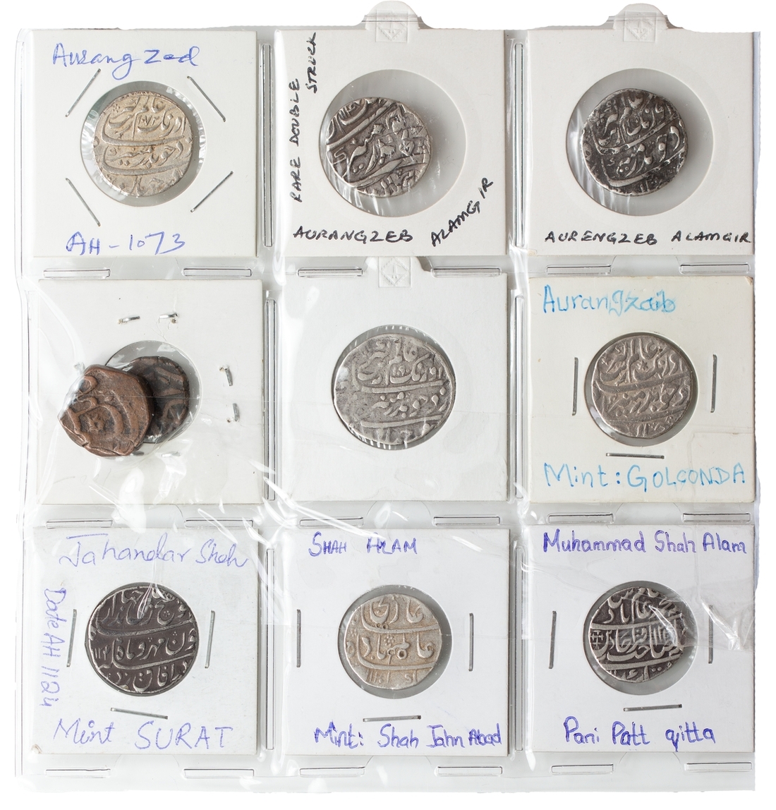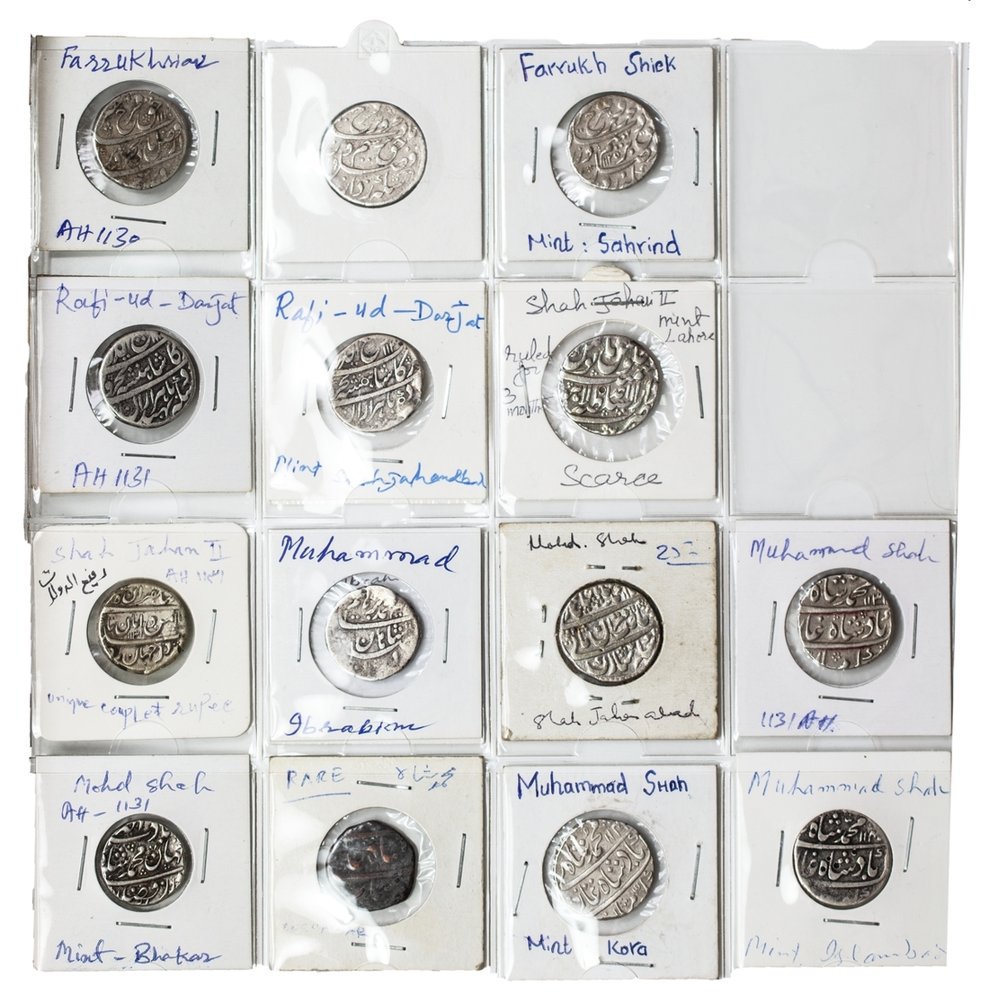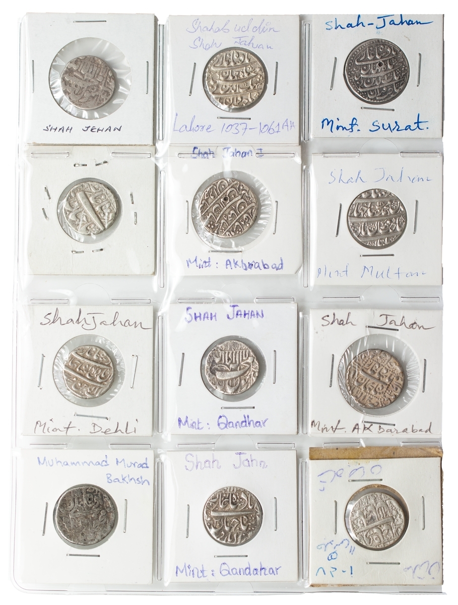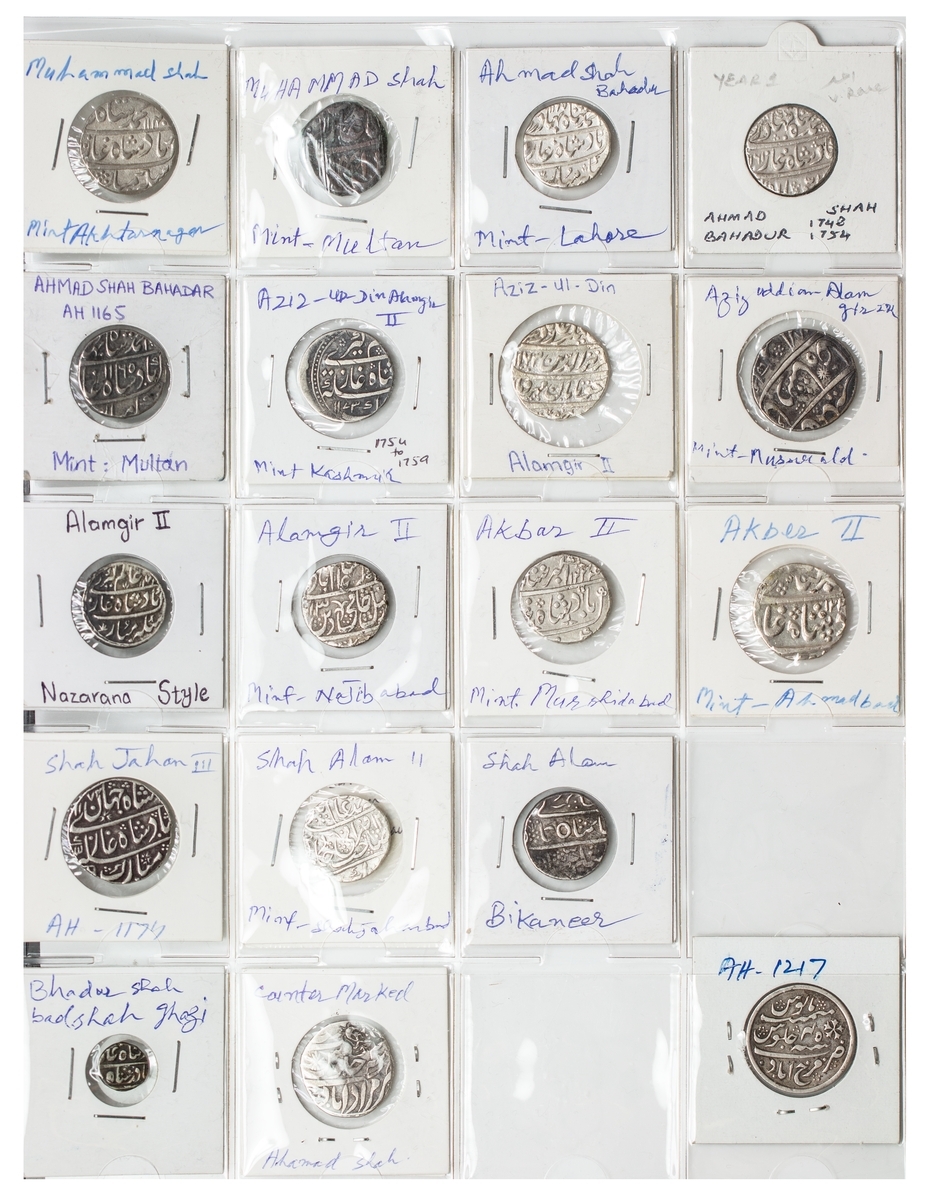 India, Mughal Empire, Farrukhsiyar (1713-1719), Rupees (3), very fine; Rafi ud-Darjat (1719), Rupees (2), both Shahjahanabad (KM 405.19), scarce, both fine or nearly so; Shah Jahan II (1719), Rupee, Lahore (KM 415.16), a few test punches, cleaned, very fine, scarce single year type; Muhammad Shah (1719-48), Rupees (8), one with title 'Ba-luft-Allah Badshah i-zaman,’ AH 1131 (KM 434.4), AE Paisas (2), the Rupees fine or better, the Paisas about fine; Ahmad Shah II (1748-54), Rupees (3), good very fine to extremely fine; Alamgir II (1754-59), Rupees (4), toned very fine; Shah Jahan III (1759-60), Rupee, Maha Indrapur mint, AH 1174, (KM 475.8), toned good very fine, another scarce single year type; together with other Rupees of the Independent Kingdoms and Princely States (6), including a countermarked Rupee of Muradabad and a Kori, very fine or better (32)