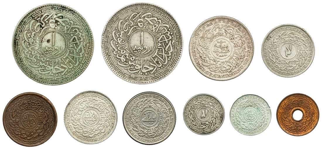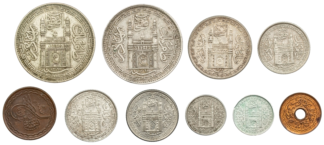 India, Princely States, Hyderabad, Mir Usman Ali Khan (1911-1948), Rupee, AH1361 / 32 (1942) (2) (KM Y63); Half-Rupee, AH1342 / 13 (1924) (KM 53A); 4-Annas, AH1354 / 25 (1935) ; AH1362 / 33 (2) (KM Y51;61;65); 2-Annas, AH1355 / 26 (1936); AH1362 / 33 (1943) (KM Y50; Y60); 2-Pai, AH1347 / 19 (1929) (KM 46a); 2-Pai, AH1368 / 39 (1949) (KM Y58), some with verdigris, very fine to extremely fine (10)