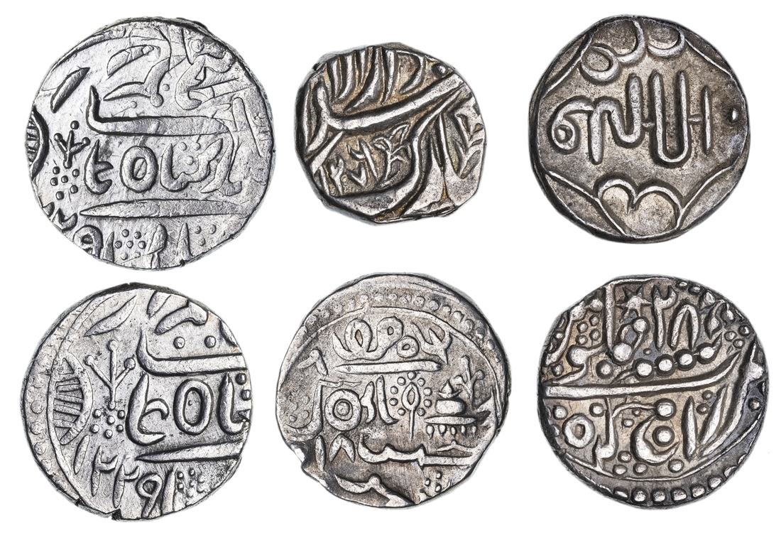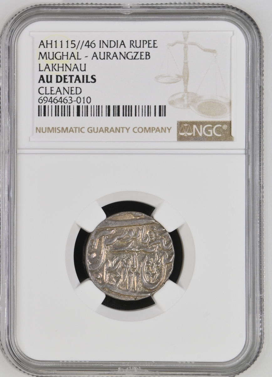 NGC AU | India, Independent States, Rohilla Chieftaincies, in the name of Shah 'Alam II Rupee, 11.02g, Ghausgarh mint, 'pseudo' mint name Najibabad, ry. 46, katar by regnal year (KM 96.2), wiped, otherwise toned, about extremely fine, in NGC holdder, graded AU Details ~ cleaned, wrongly described (Cert. #6946463-010); Princely States, Alwar, in the name of Mohammad Akbar II (1806-1837), Rupee, Rajgarh, AH1238, ry. 28 (KM 20), test punch on edge, toned very fine; Bahawalpur, temp. Muhammad Bahawal Khan IV (1858-1866), Rupee, AH1276 (KM Y# 3.3), obverse weakly struck, about extremely fine; Banswara, temp. Lakshman Singh (1844-1905), Rupee, legend 'Samsatraba', undated (c.1870) (KM 23), toned extremely fine; Bikanir, Surat Singh (1788-1828), Rupee, fixed date AH1229, ry. 52 (of Shah 'Alam II); Ratam Singh (1828-1851), Rupee, fixed date AH1229, ry. 25 (of Mohammad Akbar II), Sardar Singh (1851-1872), Rupee, fixed date AH1229, ry. 18 (of Bahadur Shah II) (KM 17, 32, 37), cleaned, some with minor flan damage / overstriking, very fine or better (7)